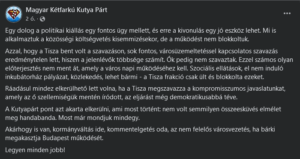 Váratlan fejleményt eredményeztek a szerdán, a fővárosi közgyűlésben lefolytatott viták, illetve az, hogy a Magyar Péter politikai formációja kivonult az ülésről: a Magyar Kétfarkú Kutya Párt egy Facebook-posztban kritizálta emiatt a Tisza Pártot. A választ magától a pártvezértől kapták meg kommentben.