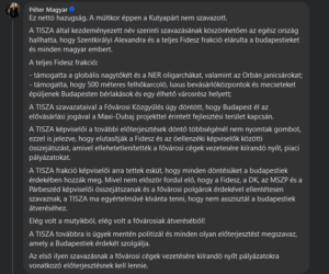 A Tisza Párt vezetője egy kommentben válaszolt a bejegyzés alatt, amiben a fentiek közül semmit sem cáfolt. Magyar Péter arra szorítkozott, hogy visszaszúrjon a pártnak, és azt írta a kétfarkú kutyáknak: