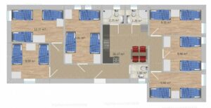 A hatalmas hirdetési ár azonban ne tévesszen meg senkit, nem egy magyar családtól kérne ennyit Barati, és nem is egy kacsalábon forgó palotáról van szó. A kívülről meglehetősen lelakott állapotban lévő ház mindössze száz négyzetméter alapterületű, a hirdetésben közzétett alaprajz-tervből viszont kiderül, hogy belülről direkt tömegszállás jellegűen alakították ki, hogy akár 14 vendégmunkást is elszállásolhassanak benne. A tíz négyzetméter alatti félszobák mindegyikében két-két ágyat helyeznének el, de egy 12 négyzetméteres szobába már három munkást is bezsúfolna Barati Ágnes (lenti kép).