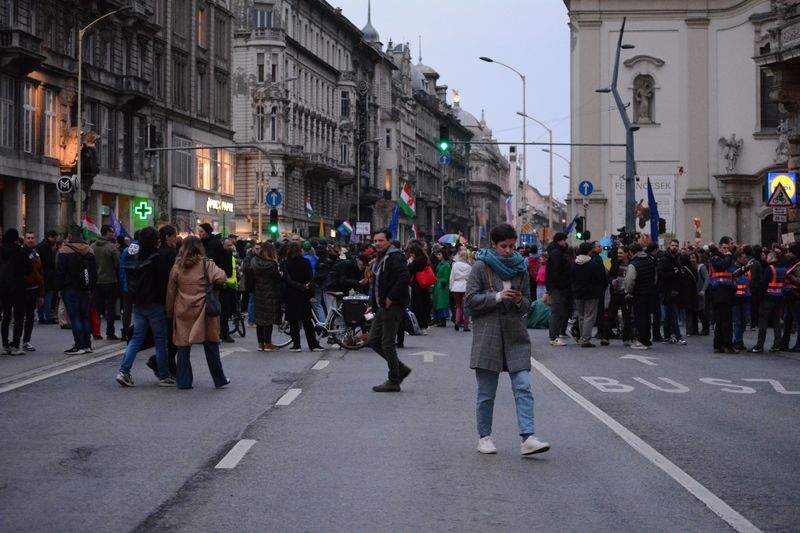 Nagyjából fél nyolckor értek véget a beszédek, ekkor – ahogy arra számítani lehetett – a tüntetők egy része elindult Budára az Erzsébet hídon át, miközben azt skandálták, hogy „a gyülekezés alapjog”. A rendőrök nem állták el az utat, csak kamerával vették a tüntetőket. A híd budai végén viszont felállt egy rendőrsorfal, azt mondták, hogy le van zárva a híd Buda felé, nem mehet át senki, aki át akar jutni, használjon másik hidat.
