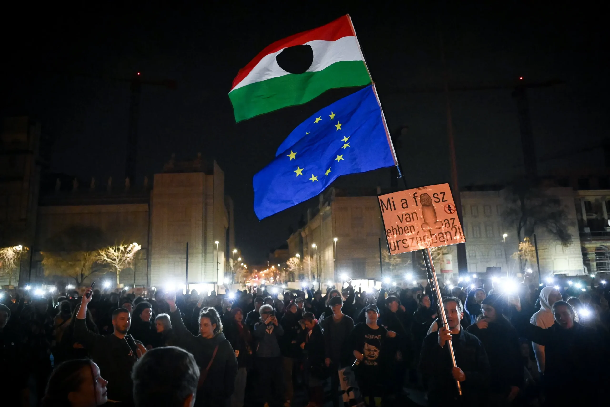 A tüntetők szabad sajtót, kormányváltást, demokráciát, jogállamot követeltek és a telefonjaikkal világították meg a rendőrsorfalat.