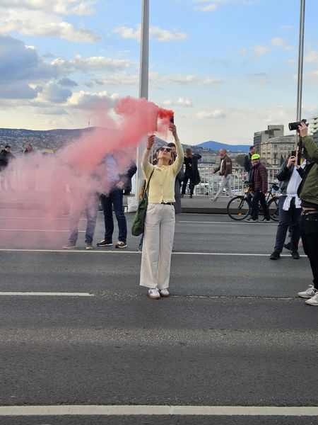 Az ismételten is a Március 15. téren gyülekező Momentumosok ezen a héten is együtt vonultak a hídra. „A gyülekezés alapjog” – skandálták a lila molinó mögött vonuló Momentumos politikusok és aktivisták. Az első sorban vonult Bedő Dávid és Tompos Márton, a párt frakcióvezetője és elnöke, és a már megszokott módon füstgyertyával is készültek, de több felfújható zebra is látható volt az aktivisták kezében.