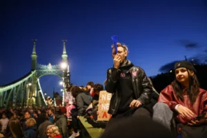Mindeközben a tömeg közepétől gyakorlatilag már egyáltalán nem hallani, hogy mi hangzik el a színpadon, de ez a résztvevőket a legkevésbé sem zavarja. A fiatalok kis csoportokban beszélgetnek, isznak, mulatnak a Momentumosok hangszóróból zenét nyomatnak, egyszóval buli hangulat alakul ki.