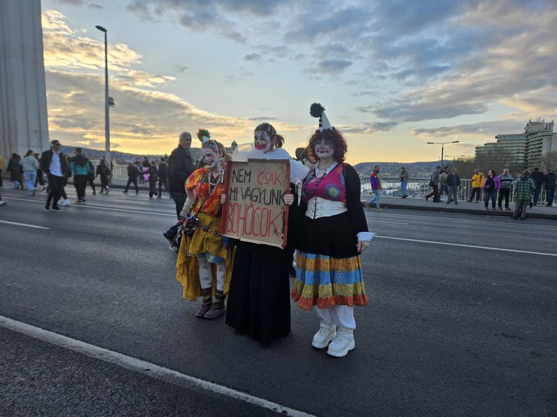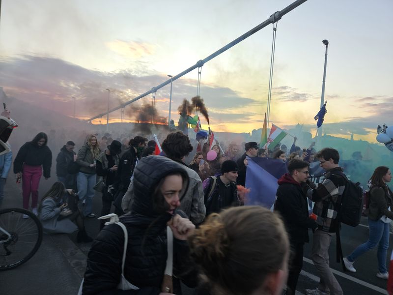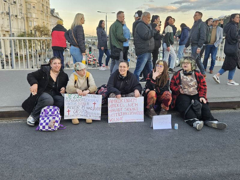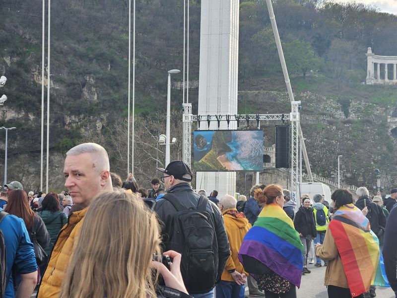 A tüntetésre a résztvevők a pesti oldalon gyülekeztek, és a hidat már egy órával a rendezvény kezdete előtt lezárták az Astoriától a Döbrentei térig. Az emberek kezében a híd mindkét oldalán „Nem a Pride-tól, hanem a kormánytól kell védeni a gyerekeket” és Orbán Viktorról, poloskákról szóló molinókat látni.