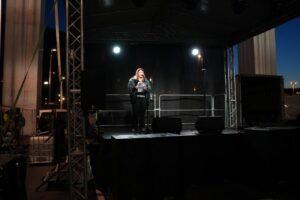 Simkó Edit tanár lépett a színpadra, aki azzal kezdte szónoklatát, hogy hazánkban oktatási vészhelyzet van, mert a pedagógusokat elküldik hazafias oktatásra, és most már azt is eldönthetik, hogy ki tanulhat intézetvezetőnek.