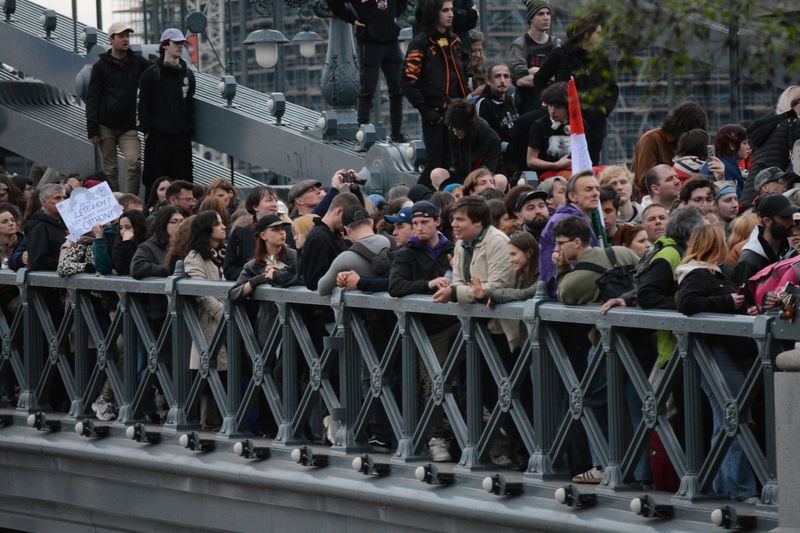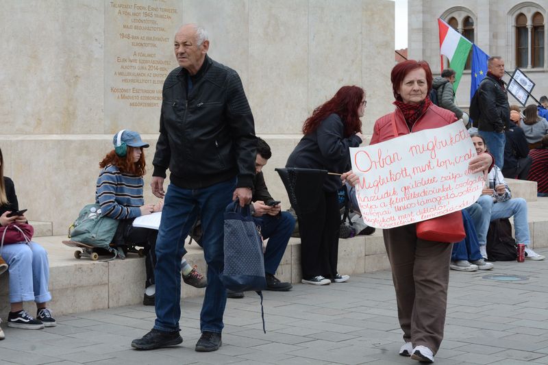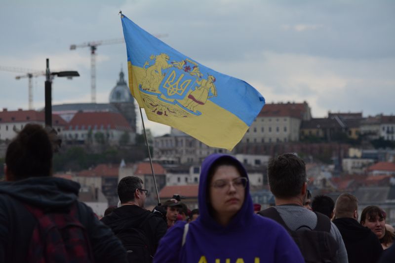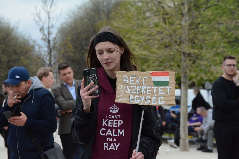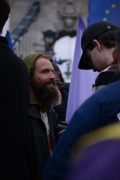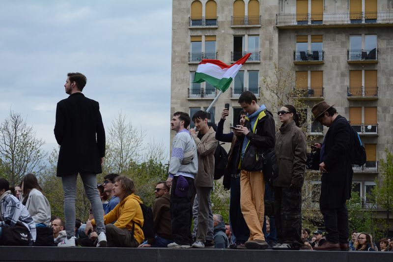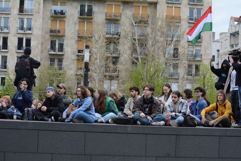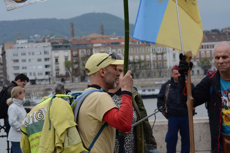 A tüntetők ezen kisebb közjáték után a Tisza István emlékműnél gyülekeztek, az égben már lobogott az ukrán, európai uniós, és momentumos zászló is, elvétve talán két magyar zászlót is lehetett látni. Miközben várakoztak a tüntetés kezdetére, Tompos Márton, a párt politikusának internetes műsora, az „Orbánék” ment a Parlament tövében felállított kivetítőn.