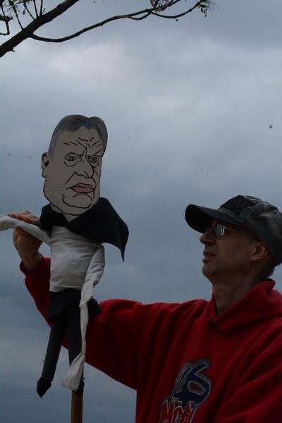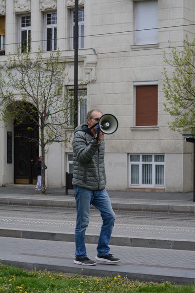 Hamarosan megjelent Karácsony Gergely és azonnal odalépett hozzá a trombitás Szabó Bálint, a volt szegedi önkormányzati képviselő, botrányhős útját azonban elállták az önkéntesek. Mindenesetre ő elkezdte játszani a Börtön ablakábant, amivel jó sok embert elvont a színpad elől.