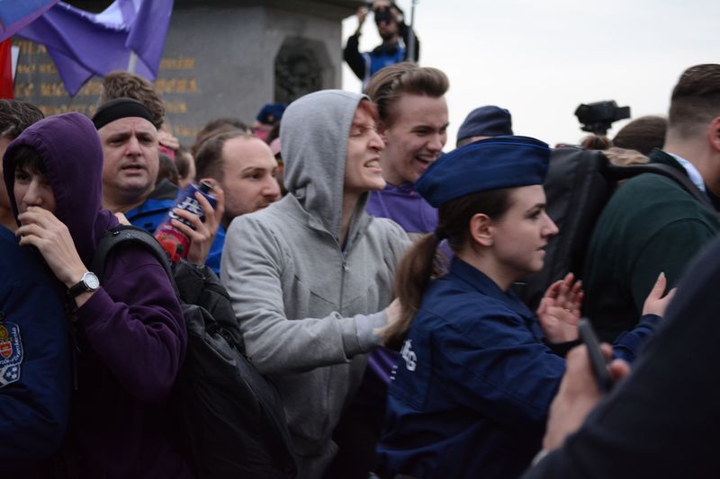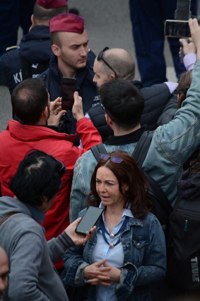 Egy ideig csak farkasszemet néztek a rendőrökkel és kérlelték őket, hogy hadd menjenek tovább, majd egyszer csak nekifeszültek a rendőrsorfalnak, hogy áttörjék.