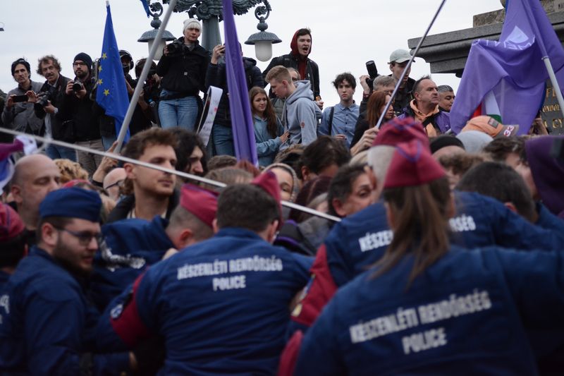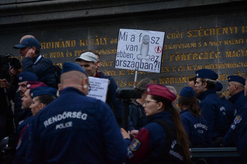A Lánchíd budai hídfőjéig jutott el a tüntetők menete, ott ugyanis rendőrsorfal várta őket.