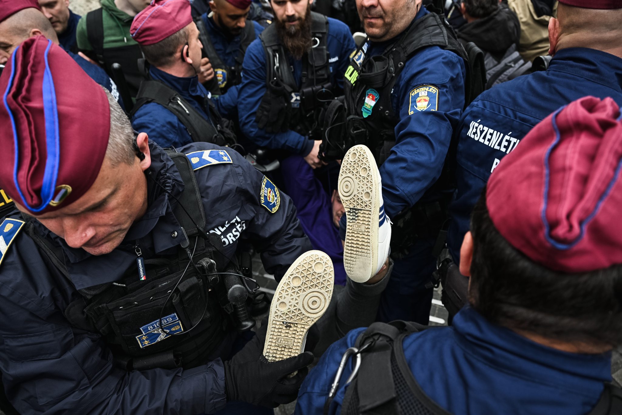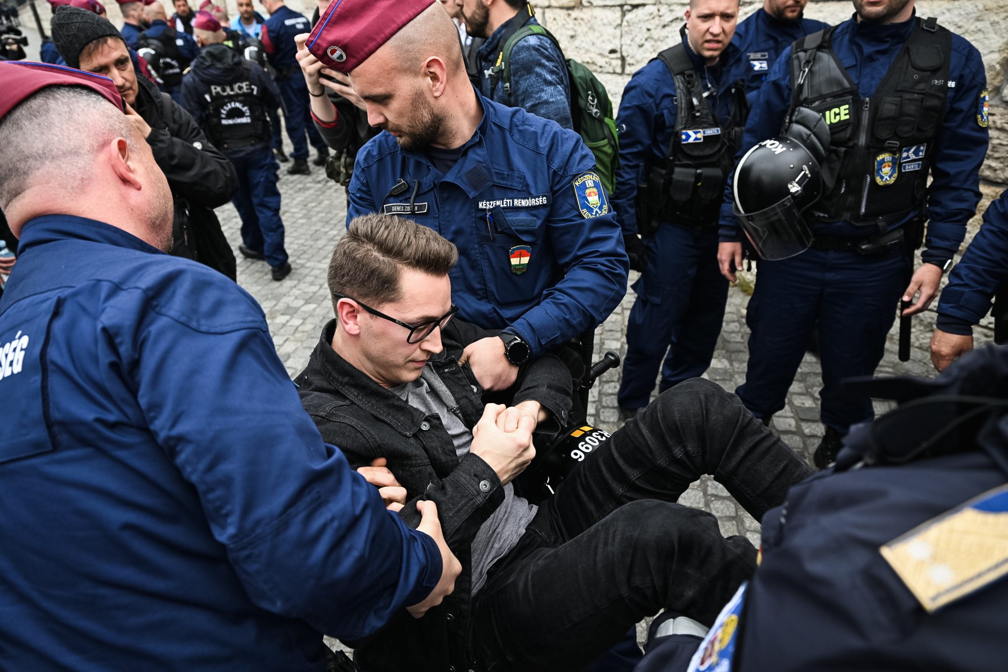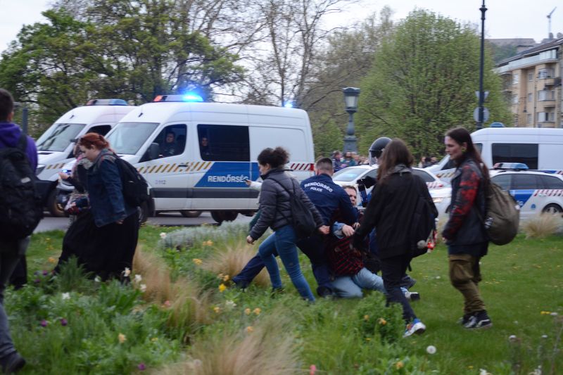 A Clark Ádám téren a rendőrök letepertek egy, a rendőr sorfalon átjutott tüntetőt a gyepen, majd megbilincselték és betették a kocsijukba.