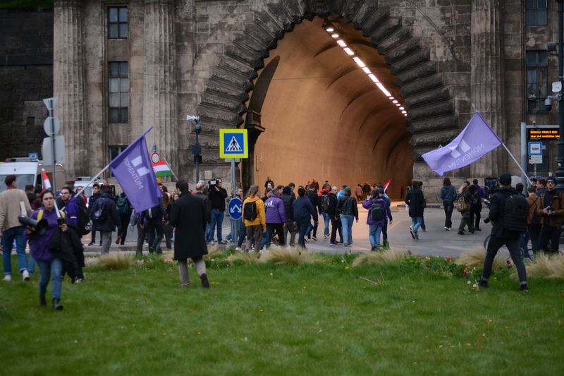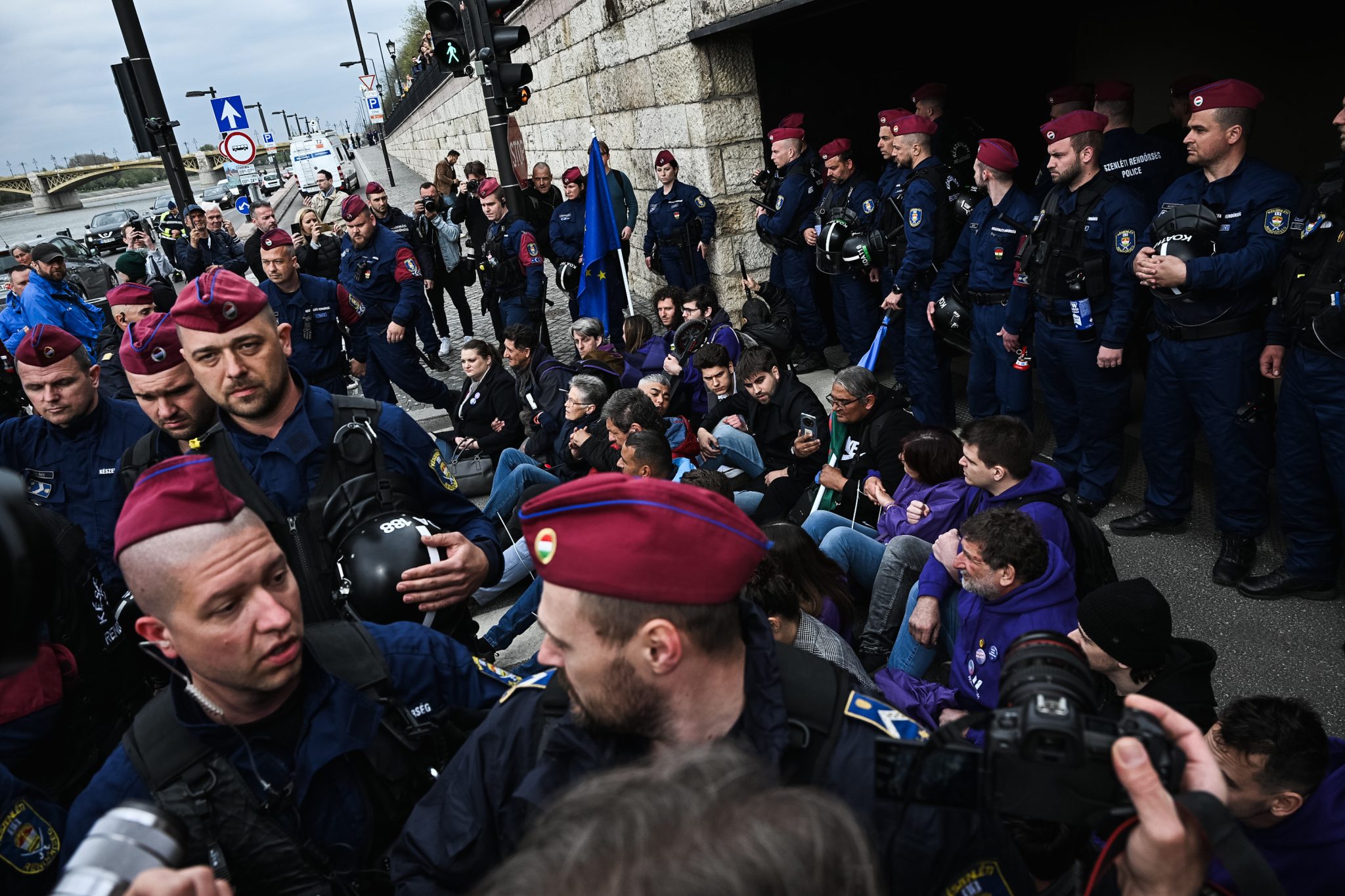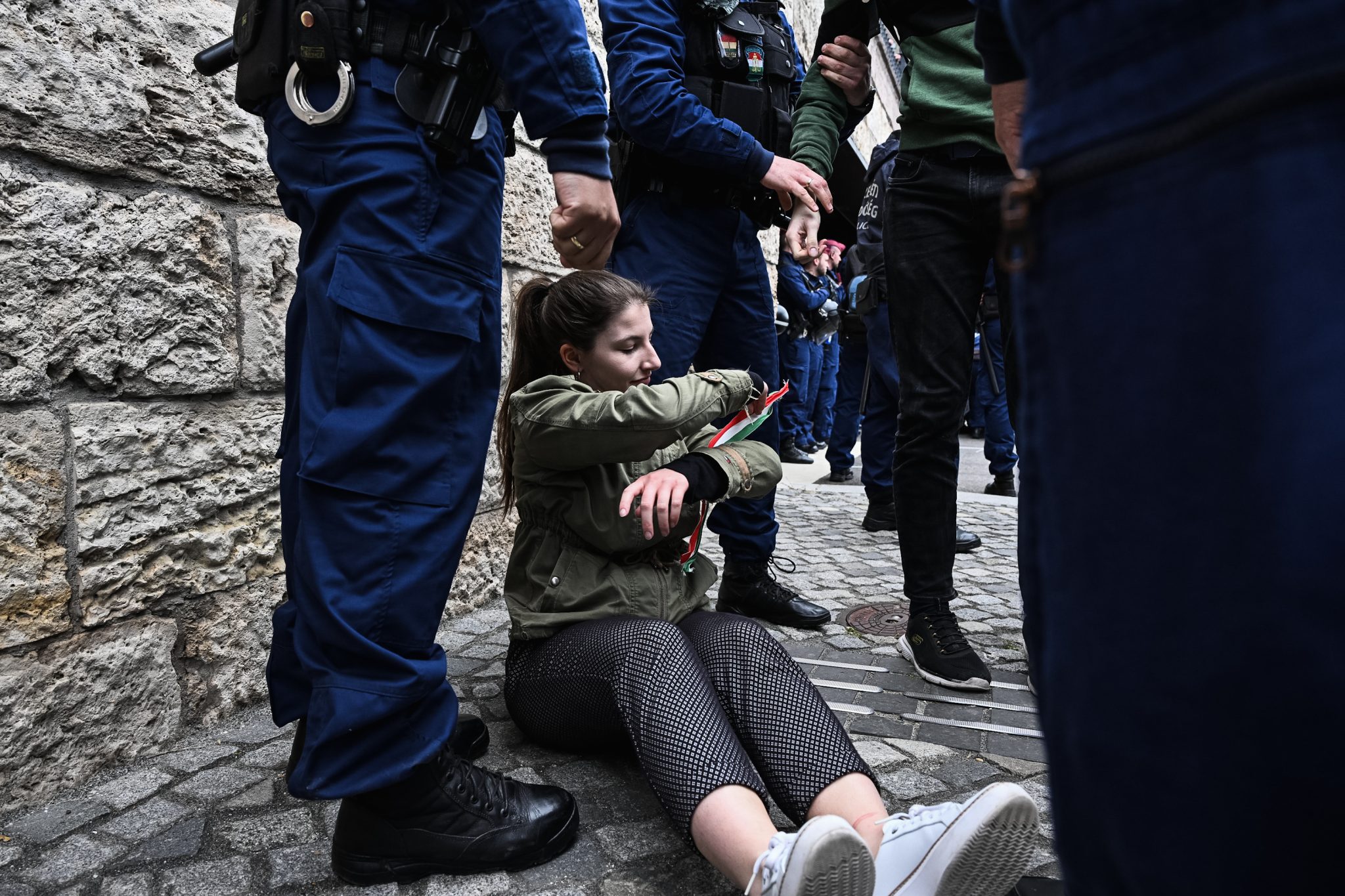 Végül a mélygarázs Duna felőli bejáratánál tüntető momentumosokhoz egy újabb csoport rendőr érkezett, és felszólították őket, hogy hagyják szabadon ezt a részt, azonban a tüntetők itt is leültek a földre. Az egyenruhások körbekerítették őket, a többieket pedig kiszorították.