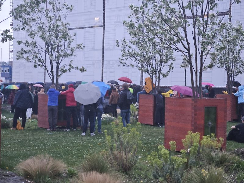 A beszédek végeztével Hadházy elénekeltette a tömeggel a Kossuth nótát, majd jelezték a szervezők, hogy a színpad mellett felállított sátorban zsíros kenyeret lehet kapni, valamit kartonlapokat, amelyekre írhattak üzenetet a tüntetők a Karmelita és a Sándor palota emberei számára. Osztogattak még fehér lapokat, hogy az emberek repülőt hajtogassanak, amivel meg lehet dobálni az épületeket.