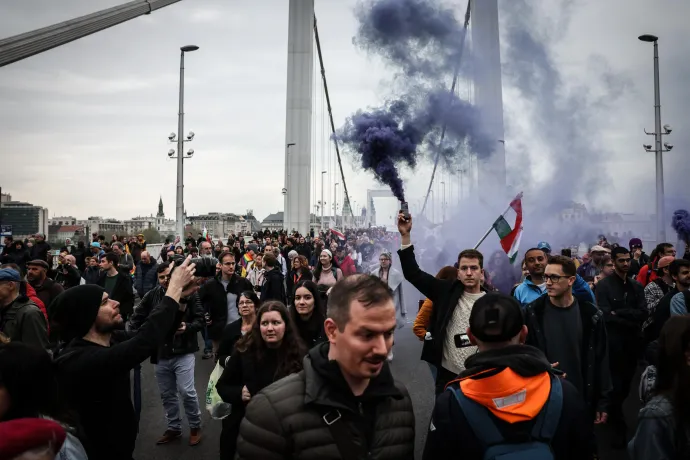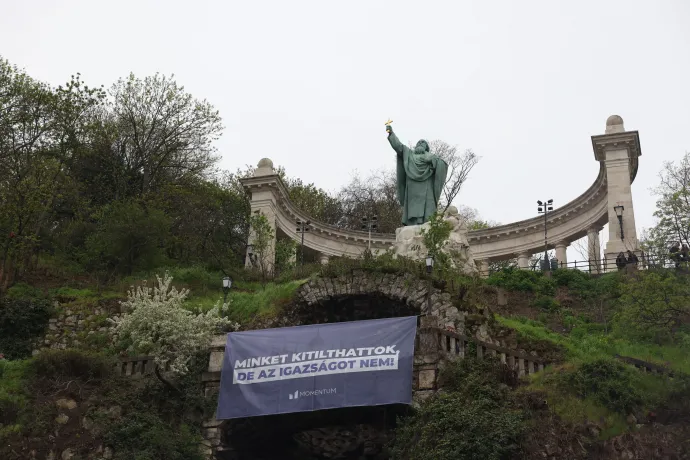 Az emberek végül negyed 7 körül indultak fel a Várba, miközben zengett a „mocskos Fidesz” és a „gyülekezés alapjog”, a Momentum pedig – szintén a már megszokott módon – füstgyertyázott: a Gellért hegy oldalában felbukkant a Momentum parlamentben is kifeszített molinója, majd lila füstbombákat is elsütöttek.