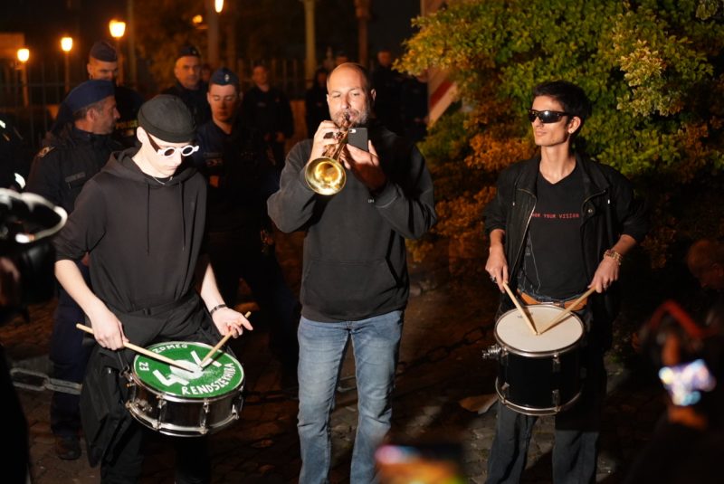 Először csak a budavári sikló épülete mellett fújta a trombitáját, és itt csatlakozott hozzá két dobos is, ám később elindult a rendőr sorfal mellett a Karmelita előtti kordonokhoz, melyeken trombitával együtt kétszer is megpróbált átmászni.