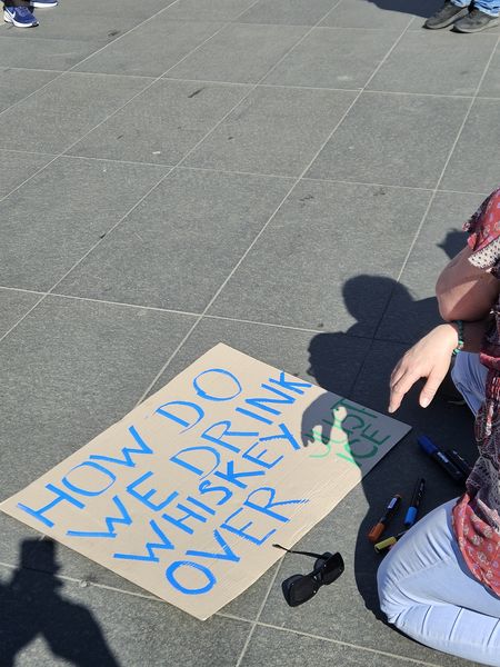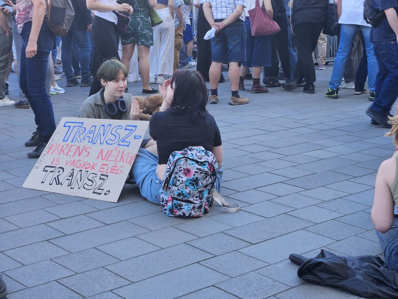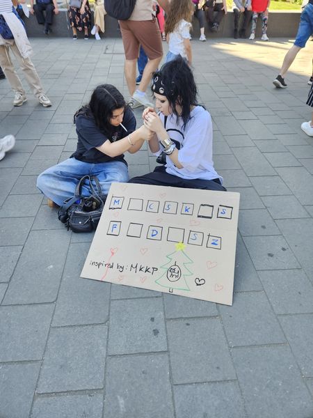 A tér közepétől valamivel jobbra láthatósági mellényt viselő férfiak állta, mellettük pedig kartonlap-kupacok álltak. Ők arra biztatták az embereket, hogy készítsenek transzparenseket, írják fel véleményüket, üzenetüket a lapokra.