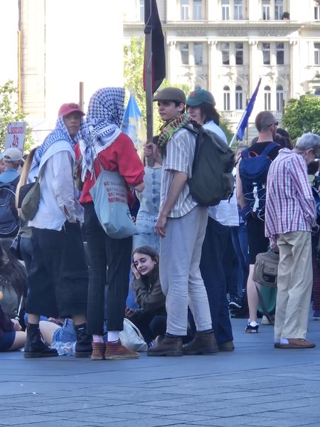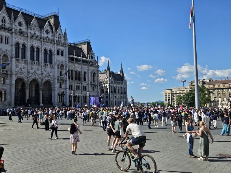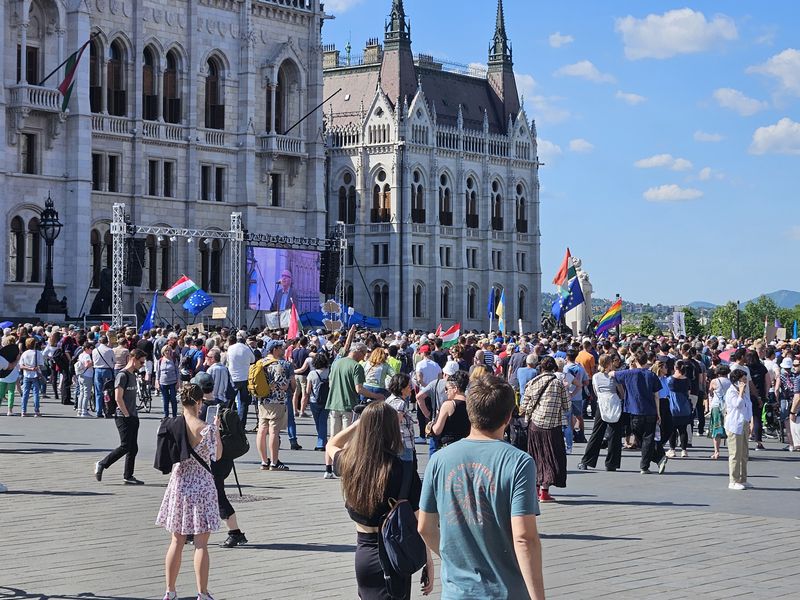 Itt a három órára meghirdetett kezdésre elég kevesen gyűltek össze, bár tény, hogy a sok turista miatt elég nehezen lehetett eldönteni, ki akar tüntetni, és ki az, aki csak a Parlamentet nézi. A napsütés és a meleg miatt ráadásul sokan árnyékba húzódtak, különösen, hogy a színpadon és a nagy kivetítőt is még csak építették a kezdés időpontjában.