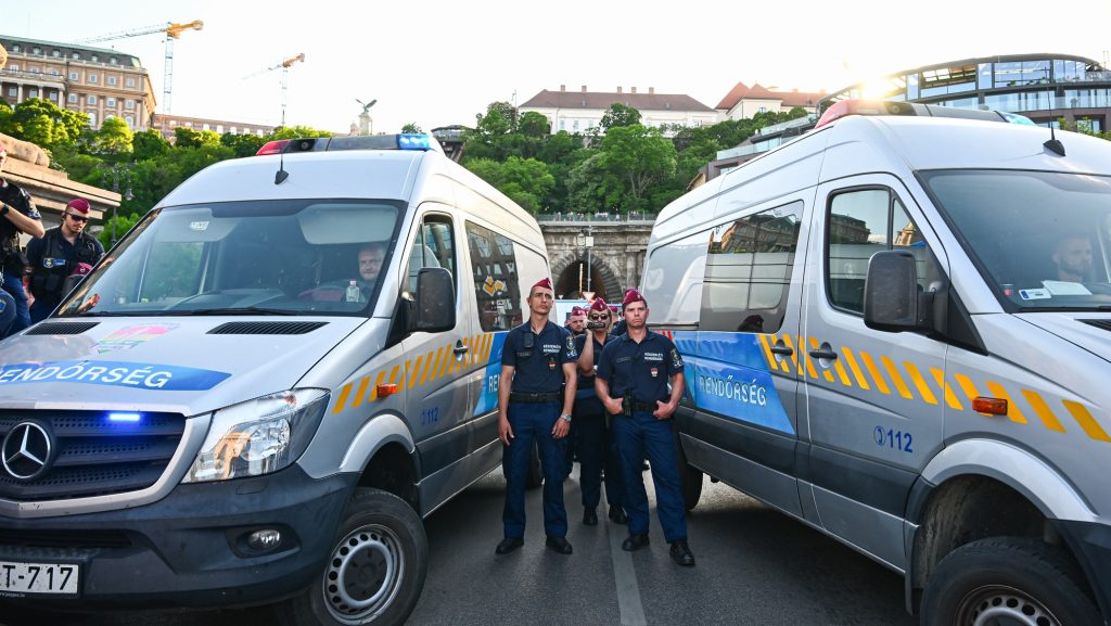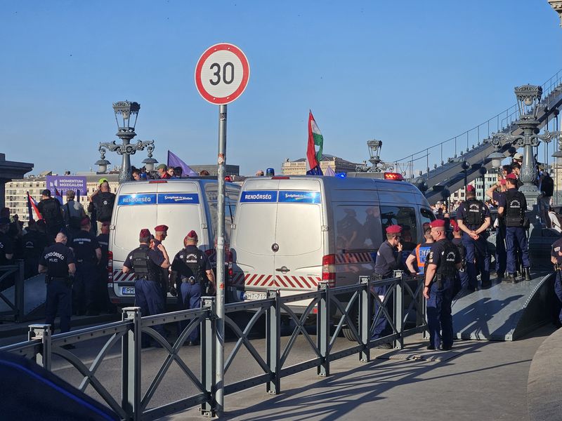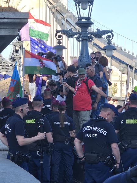 A budai hídfőnél azonban rendőr sorfal várta a menetet, és nem engedték őket tovább., bár Bedő Dávid jó ideig próbált egyezkedni a rendőrökkel.