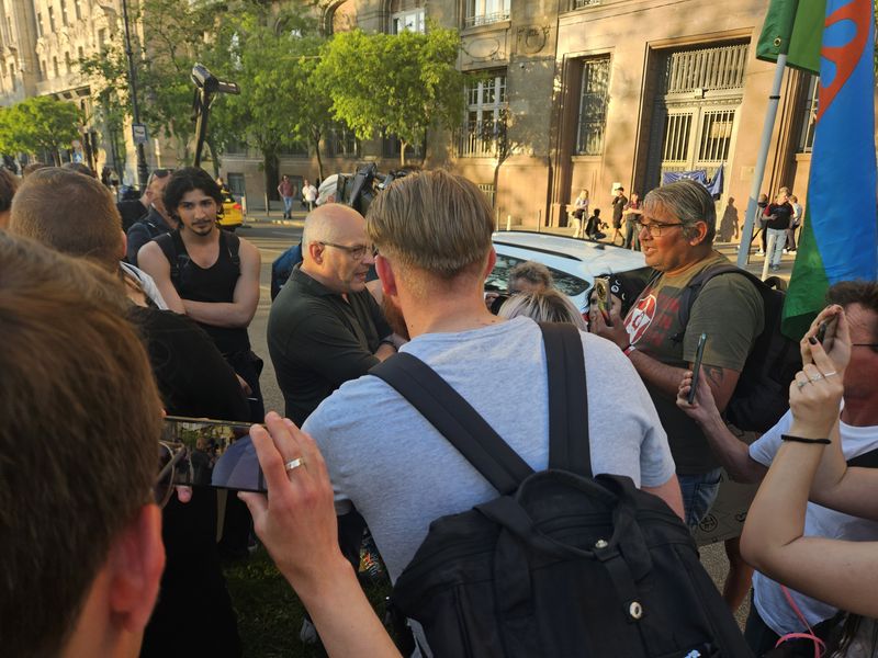 Szabó Bálint Császár elé állt, és úgy tűnt, nem akarja elengedni, mögötte a Ligetvédők Antal Nikolettája nyújtott neki támogatást, egy hangosbeszélőn át ordibálva, egy másik férfi pedig folyamatosan a sípját fújta. Császár végül valahogy kiszabadította magát az őt körbe vevő tömegből, de a dühös tüntetők egy csoportja továbbra is követte minden lépését.