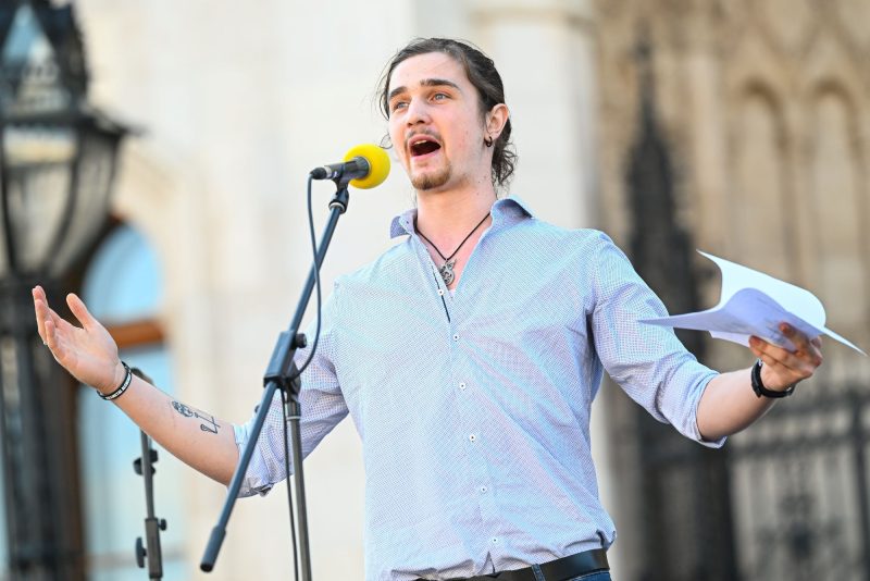 Következett a színpadon egy önmagát magyar fiatalként bemutató férfi, Kakas Mátyás, aki a beszédét azzal kezdte, hogy szégyellnie kell, hogy magyar. Szerinte ugyanis Magyarországot máshol már Kis-Oroszországnak nevezik, és amit a török 150 év alatt nem tudott elpusztítani, azt a Fidesz megtette.