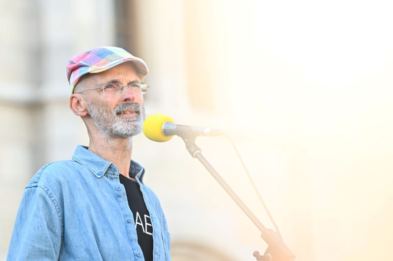 Megkérte a tüntetés résztvevőit, hogy emelje fel a kezét, aki elhiszi, hogy az általuk kifogásolható törvény visszavonását ki lehet kényszeríteni, majd megállapította, hogy a látható többség hisz ebben, hiszen a téren levő, nagyjából 400-450 ember java része felemelte a kezét.
