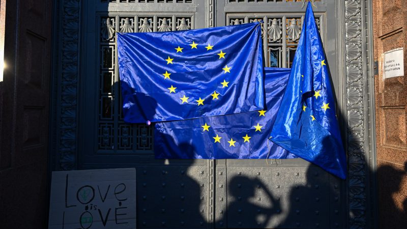 Hét óra körül az időközben jelentősen megfogyatkozott létszámú tüntető társaság megérkezett a Belügyminisztérium épületéhez, aminek főbejáratára a momentumos képviselők egy európai uniós zászlót tűznek ki.