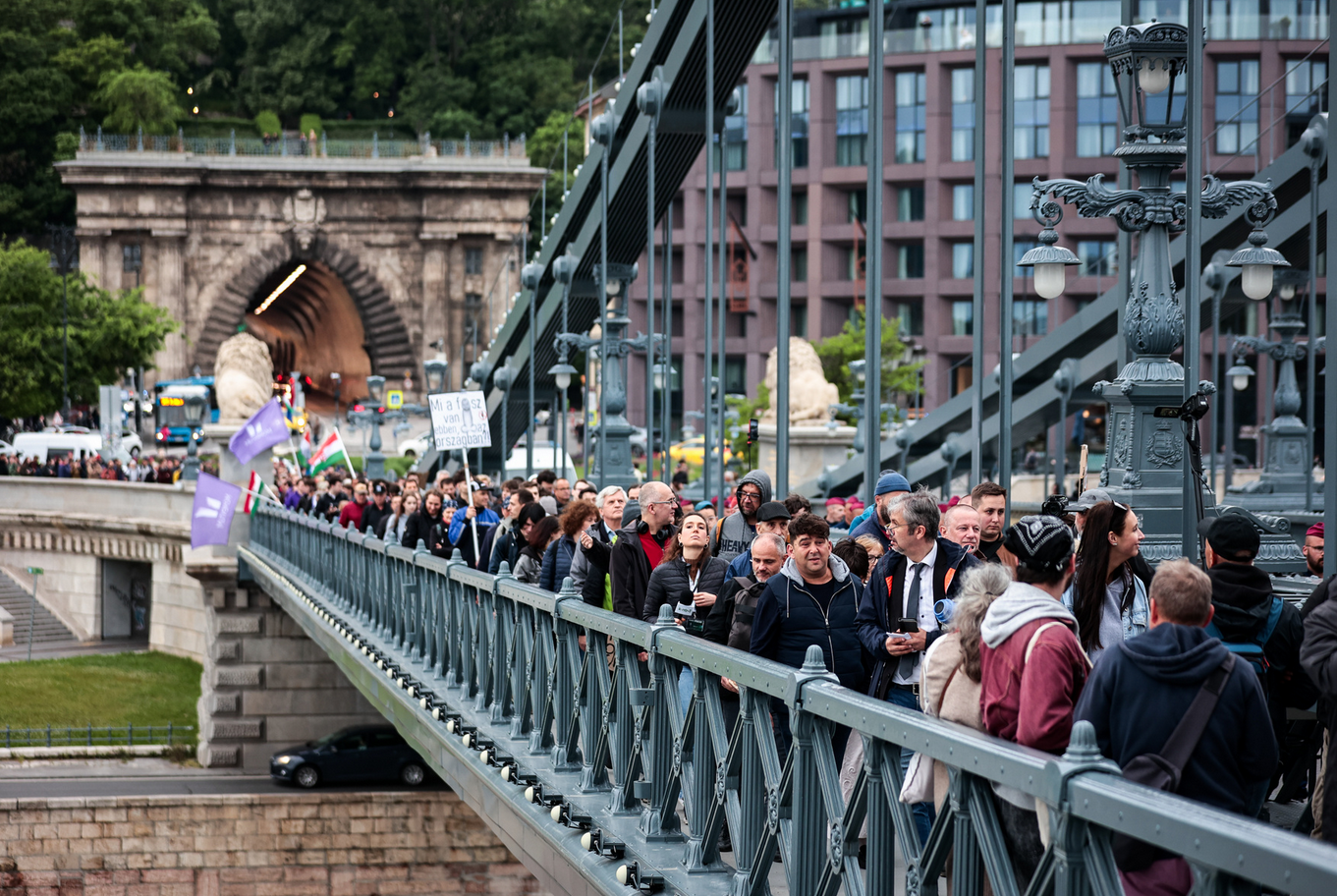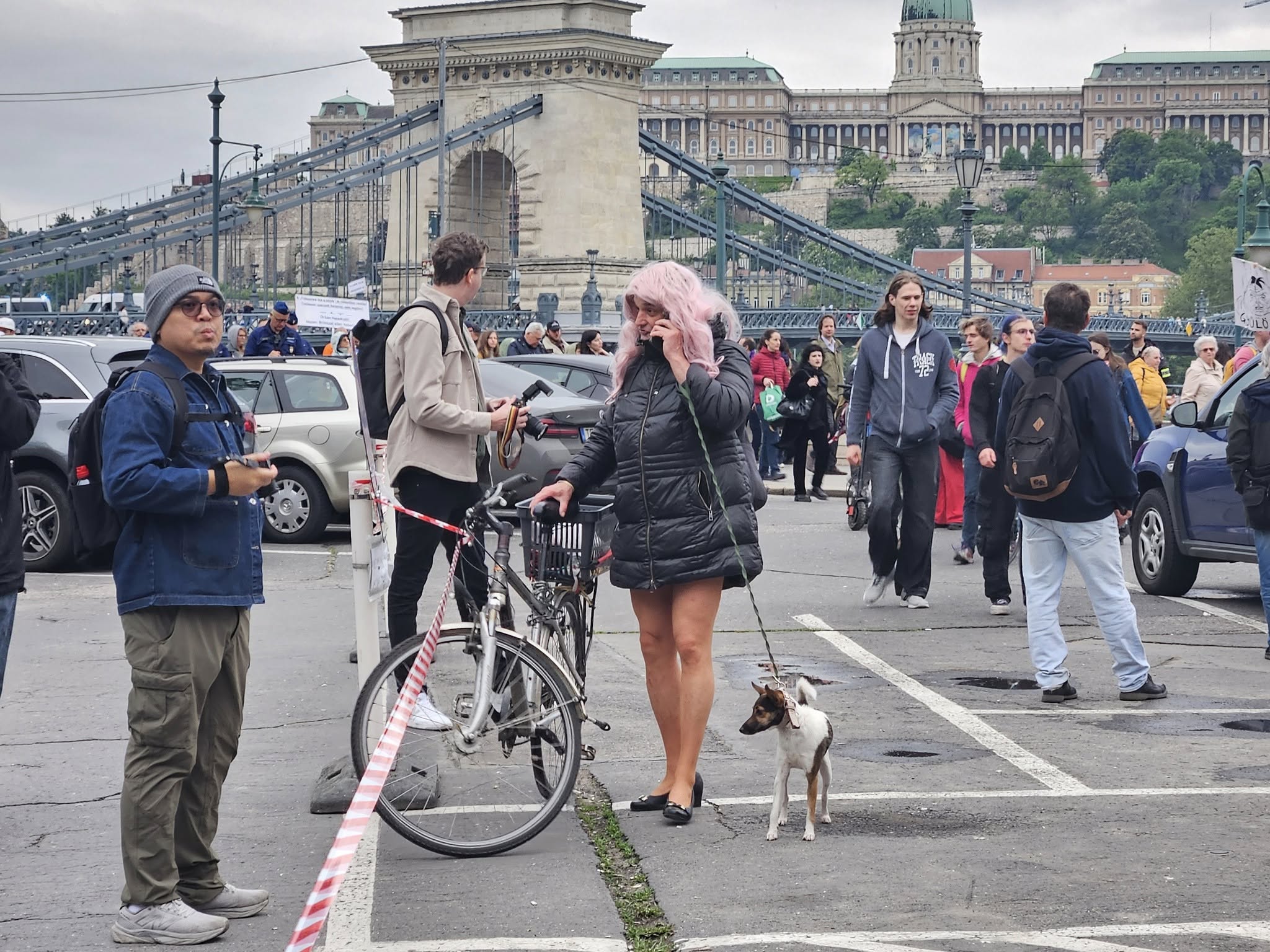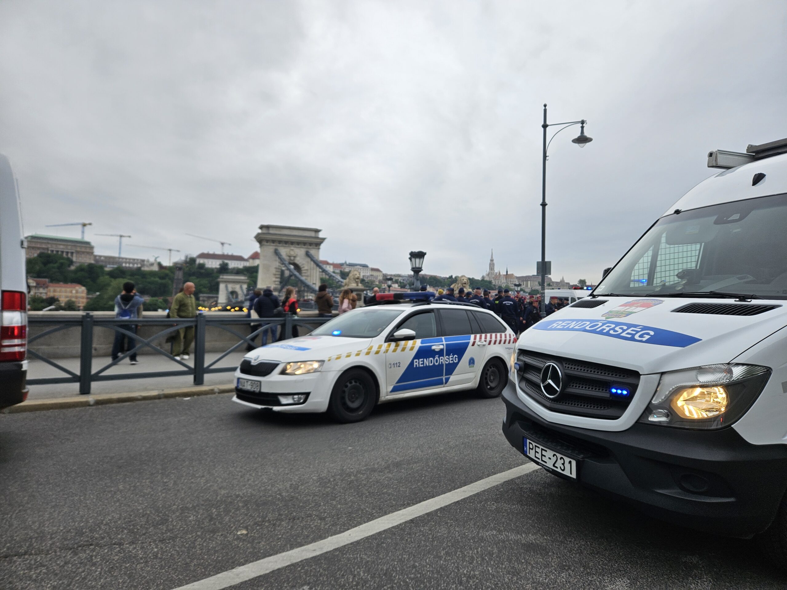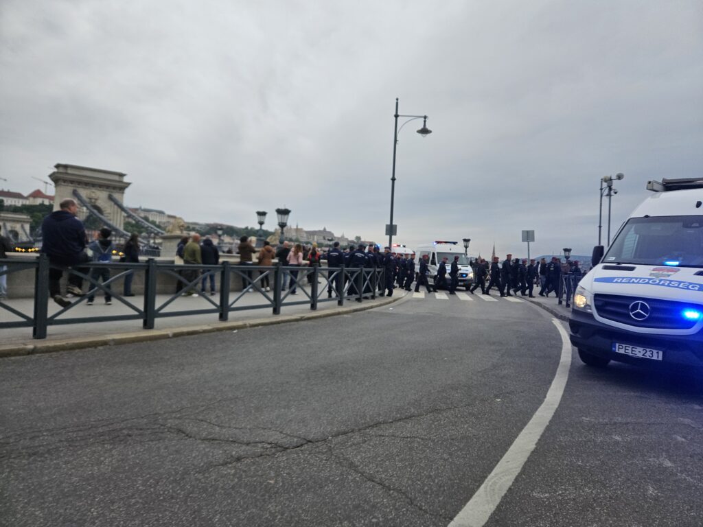 Ekkorra a rendőrök már sorakoznak a Lánchídnál, hogy a tömeg a szabályokat betartva kelljen át rajta, így aztán rendőrsorfal állt végig a járda mellett, hogy senki ne hagyja el a gyalogosoknak kijelölt területet.