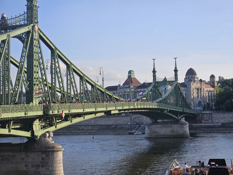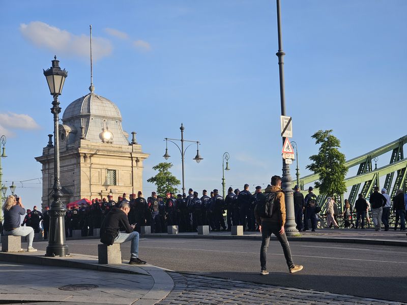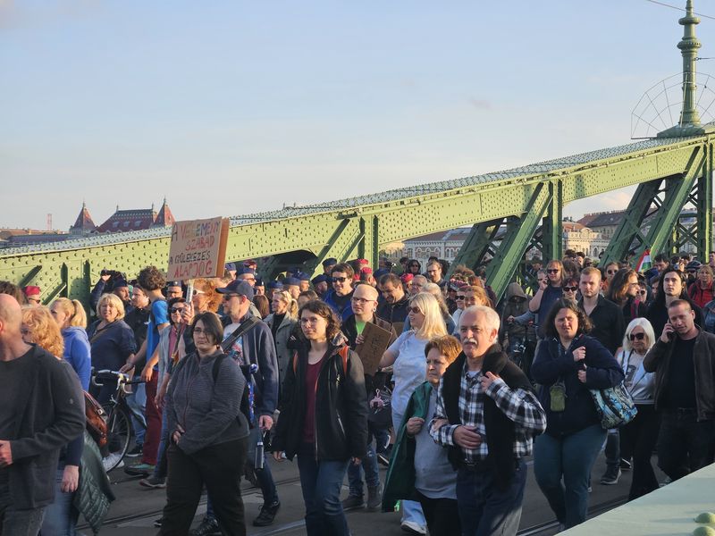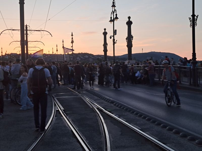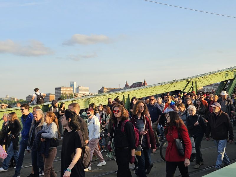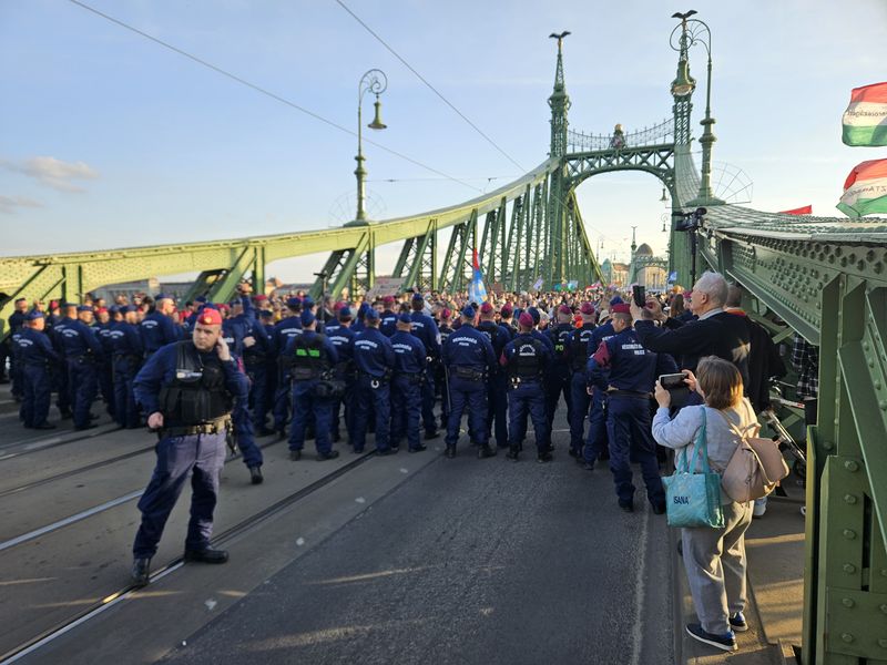 Háromnegyed hét tájban el is indultak a Szabadság hídra, teljes szélességében elfoglalva az úttestet, ezért a közlekedés biztonsága érdekében elterelték a járműforgalmat, ám a híd közepén a rendőrség megállította a menetet, és mögöttük is felsorakoztak a rendőrök.
