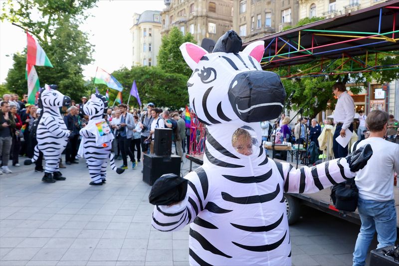 A fiatalember beszéde közben három zebrajelmezes demonstráló csatlakozott, úgy látszik, megérkeztek a Temuról rendelt zebrajelmezek.