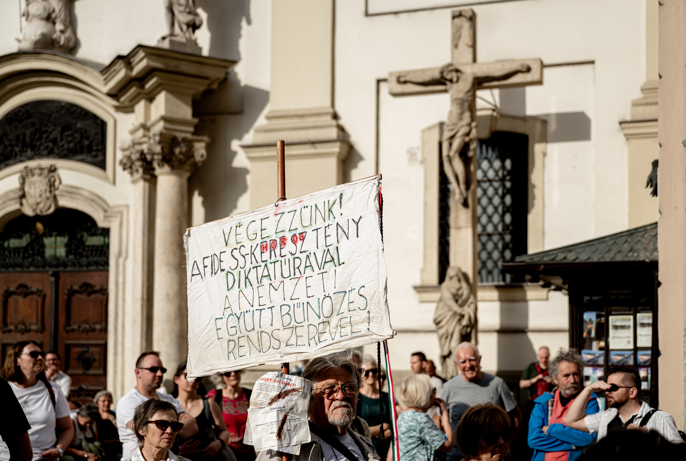 A zene után egy történész-informatikus, Szűcs Gábor beszéde következett, aki kifejtette, hogy 2022-ben a Fidesz úgy nyert választást, hogy lyukat ütött a költségvetésben, ami már egy rossz előjel volt. 2025-re pedig már odáig jutottunk, hogy a kormány egy orosz mintájú diktatúrát kezdett el kiépíteni.