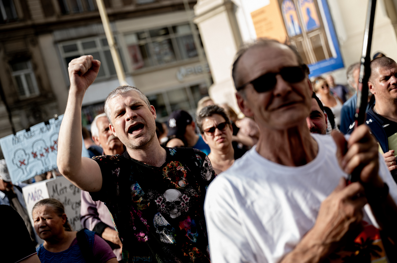 – fogalmazott. Ezután elmondta, hogy ő tanárként arra esküdött fel, hogy mindenkit ugyanúgy kezel, felekezeti, származási vagy éppen szexuális hátterétől függetlenül. Szerinte a tisztességes emberek itt vannak a tüntetésen, és bár büszke magyar, nem örül annak, hogy Orbán Viktor a miniszterelnök. „Nekem ő nem a miniszterelnökön” – jelentette ki.