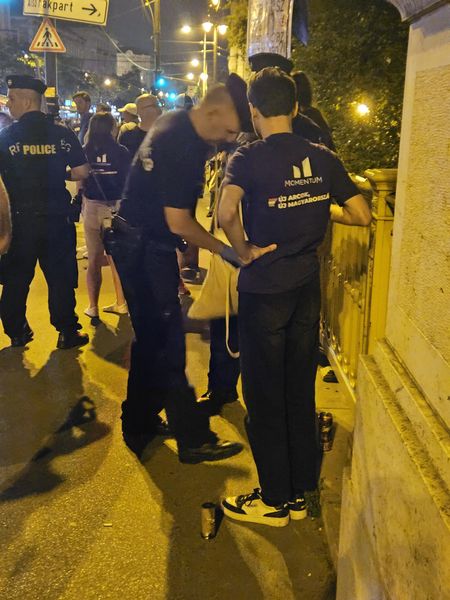Közben megérkeztek a Momentumosok is, akik füstgyertyákkal vonultak, és próbáltak az úttestre „tévedni”, de ez nem sikerült nekik, mert a rendőrök körbevették és igazoltatni kezdték őket. A támogatásukra siető hölgyet és társát visszaterelték az úttestről a járdára, felhívva figyelmüket arra, hogy balesetveszélyes dolgot művelnek.