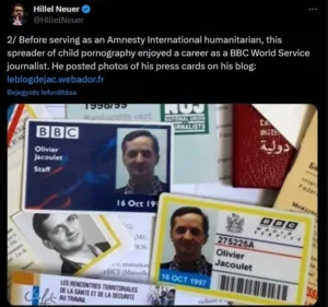 Olivier Jacoulet-et, a BBC World Service korábbi újságíróját, az Amnesty International korábbi szóvivőjét, egyetemi oktatót a laprovance.com beszámolója szerint gyermekpornográf tartalmak birtoklásában és terjesztésében találták bűnösnek. A francia bíróság ezért őt mindössze tizenöt hónap börtönbüntetésre ítélte.