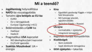 Az egykori titkosszolgálati vezető szerint Magyarország elemi érdeke, hogy részt vegyen Ukrajna újjáépítésében, és támogatnunk kell Ukrajna uniós csatlakozását. Azt is szorgalmazta, hogy a magyar haderőt tagozzák be a NATO „hajlandók koalíciójának” stratégiájába, ami Ukrajna segítése miatt is fontos lenne.