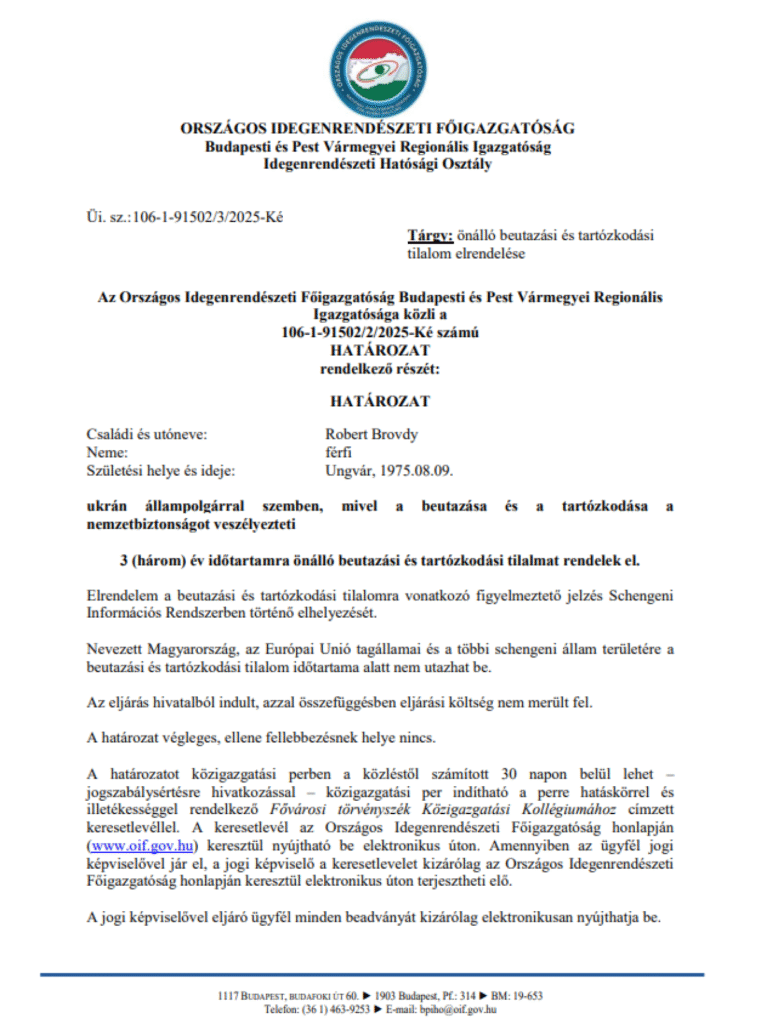 A Budapesti és Pest Vármegyei Regionális Igazgatóság határozata értelmében Robert Brovdy, ukrán állampolgár – aki 1975. augusztus 9-én született Ungváron – három évre szóló önálló beutazási és tartózkodási tilalom hatálya alá került.