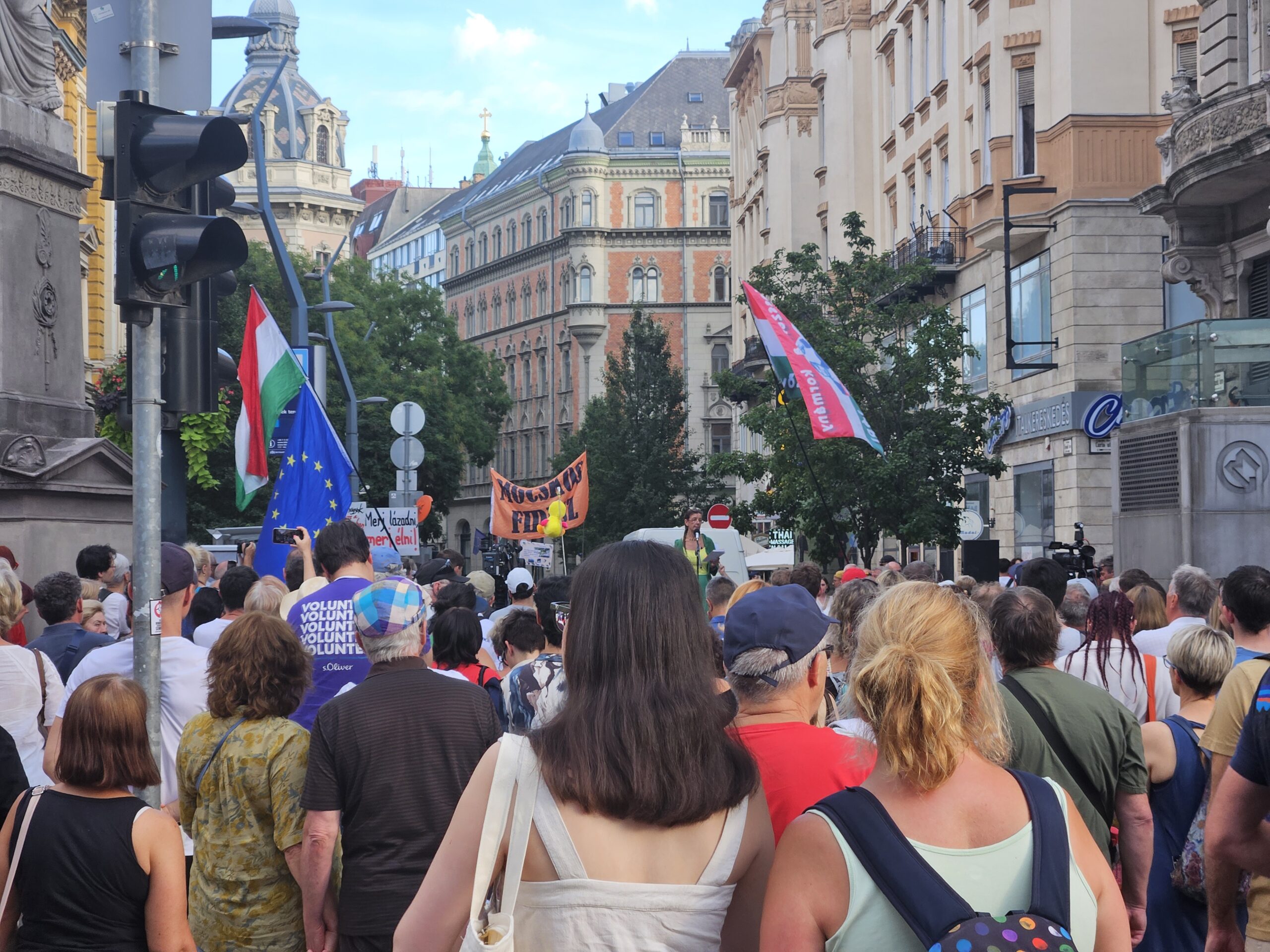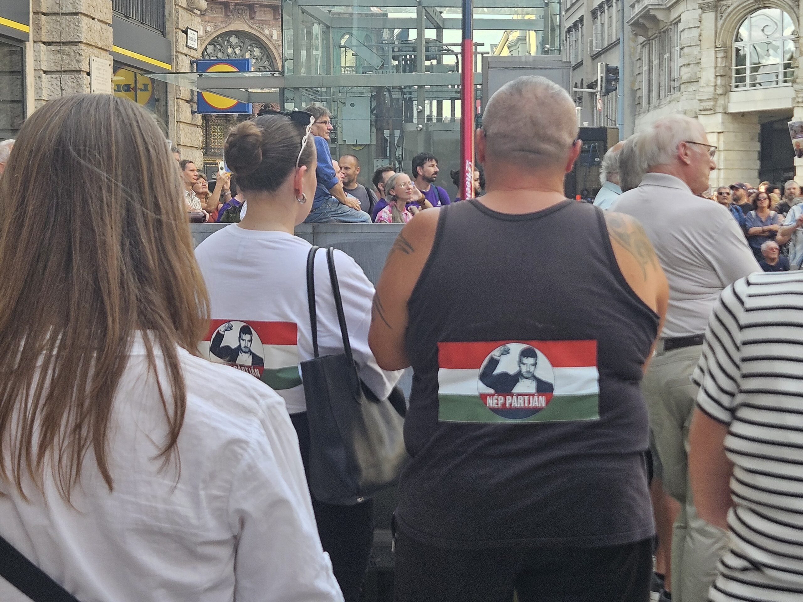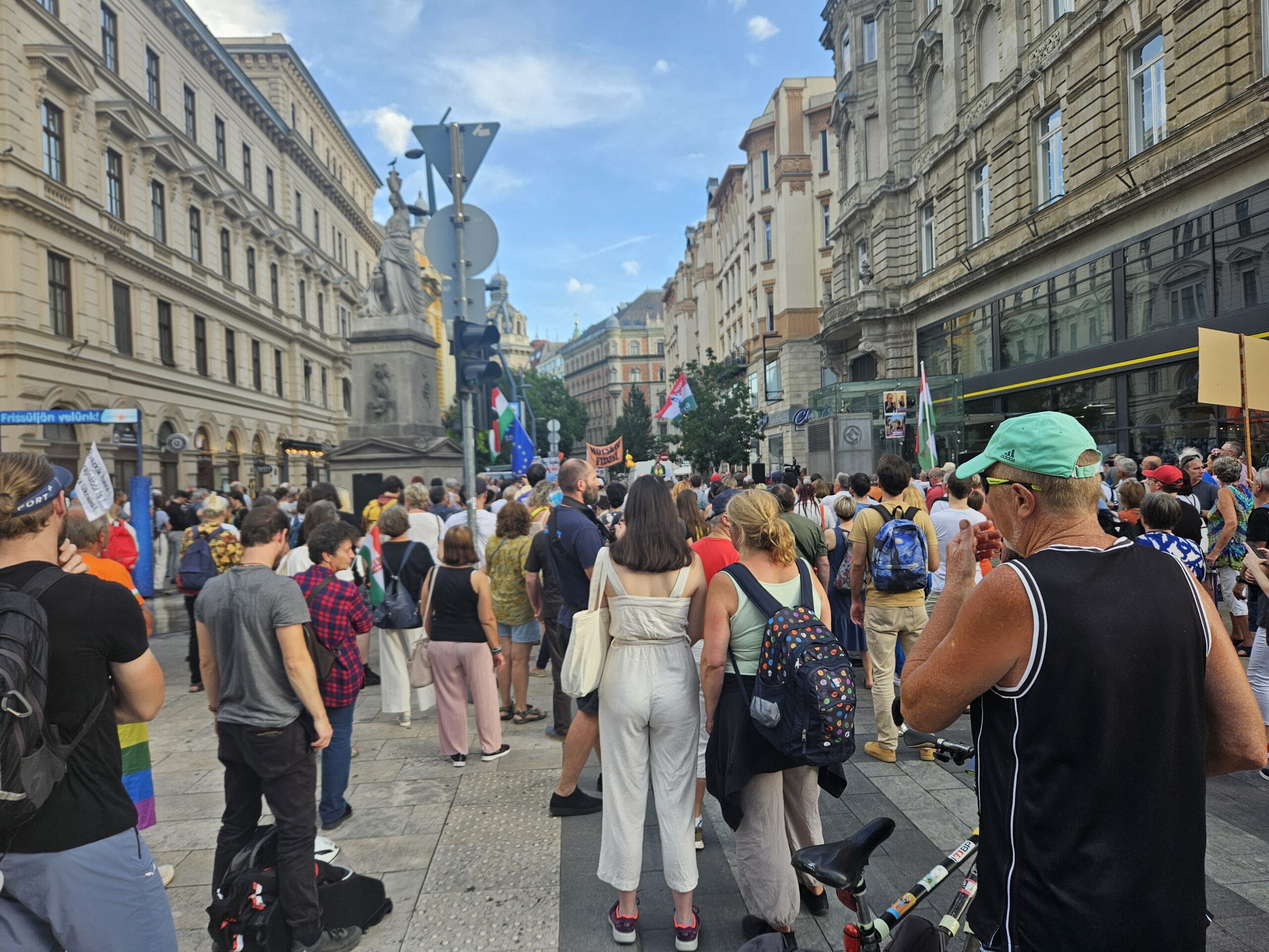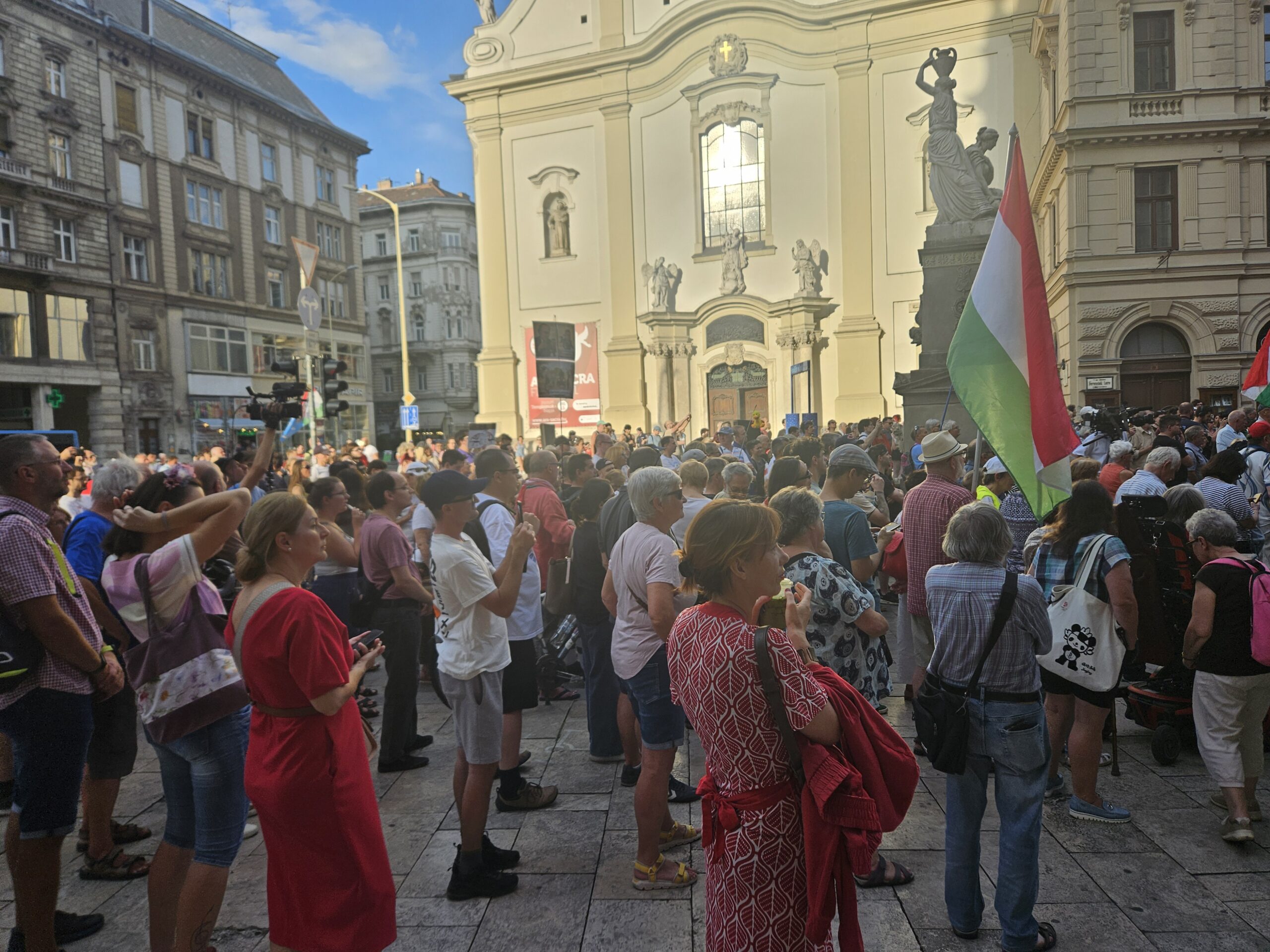 A szeptemberi újranyitó demonstráció kedden, kora este kezdődött a Ferenciek terén, ahol a kezdeti percekben még csak kisebb tömeg gyűlt össze. A színpad mellett zene szólt, a tér lassan telt meg, de a hangulat így is gyorsan tüzesedett: „Mocskos Fidesz!” – skandálták ritmusosan a résztvevők.