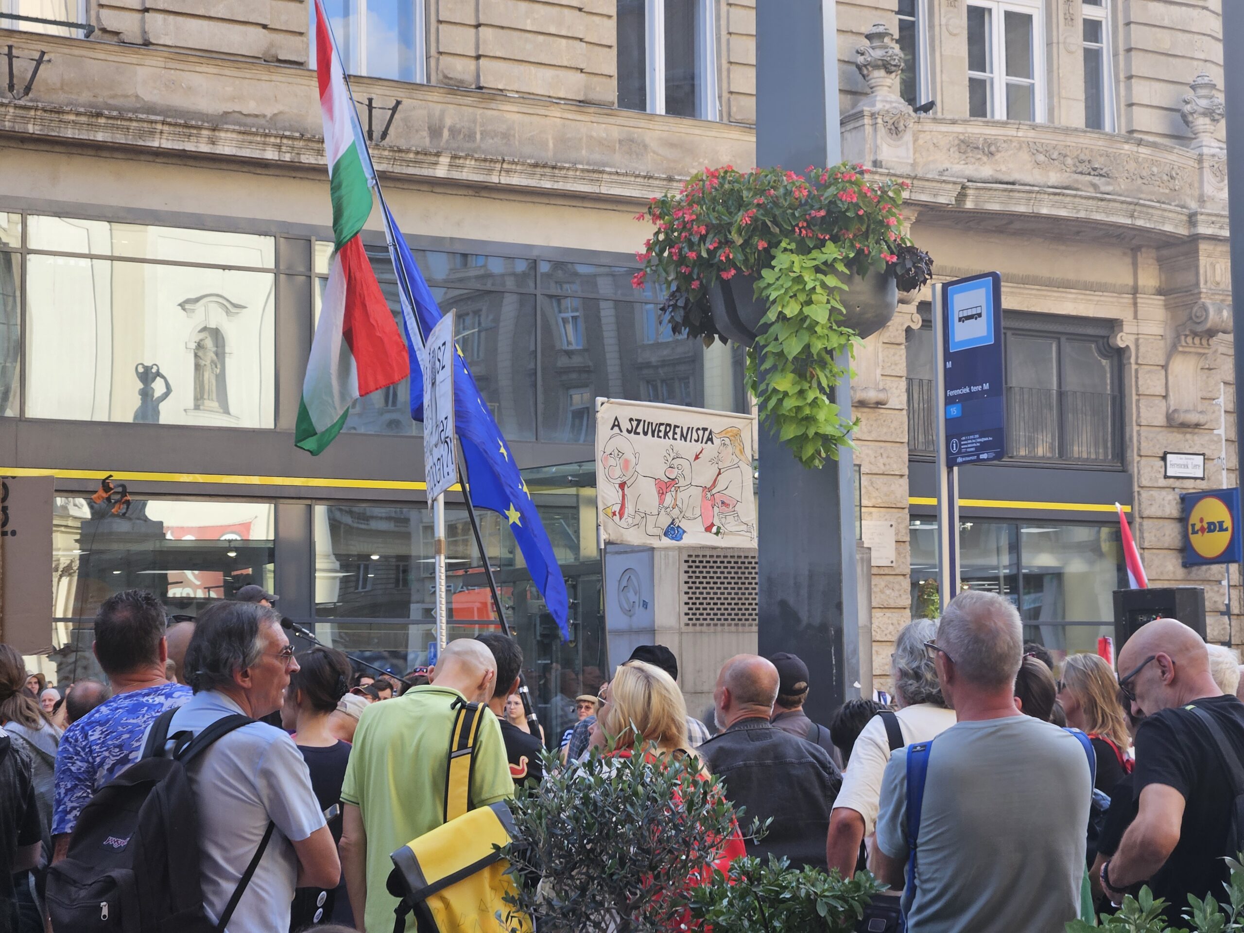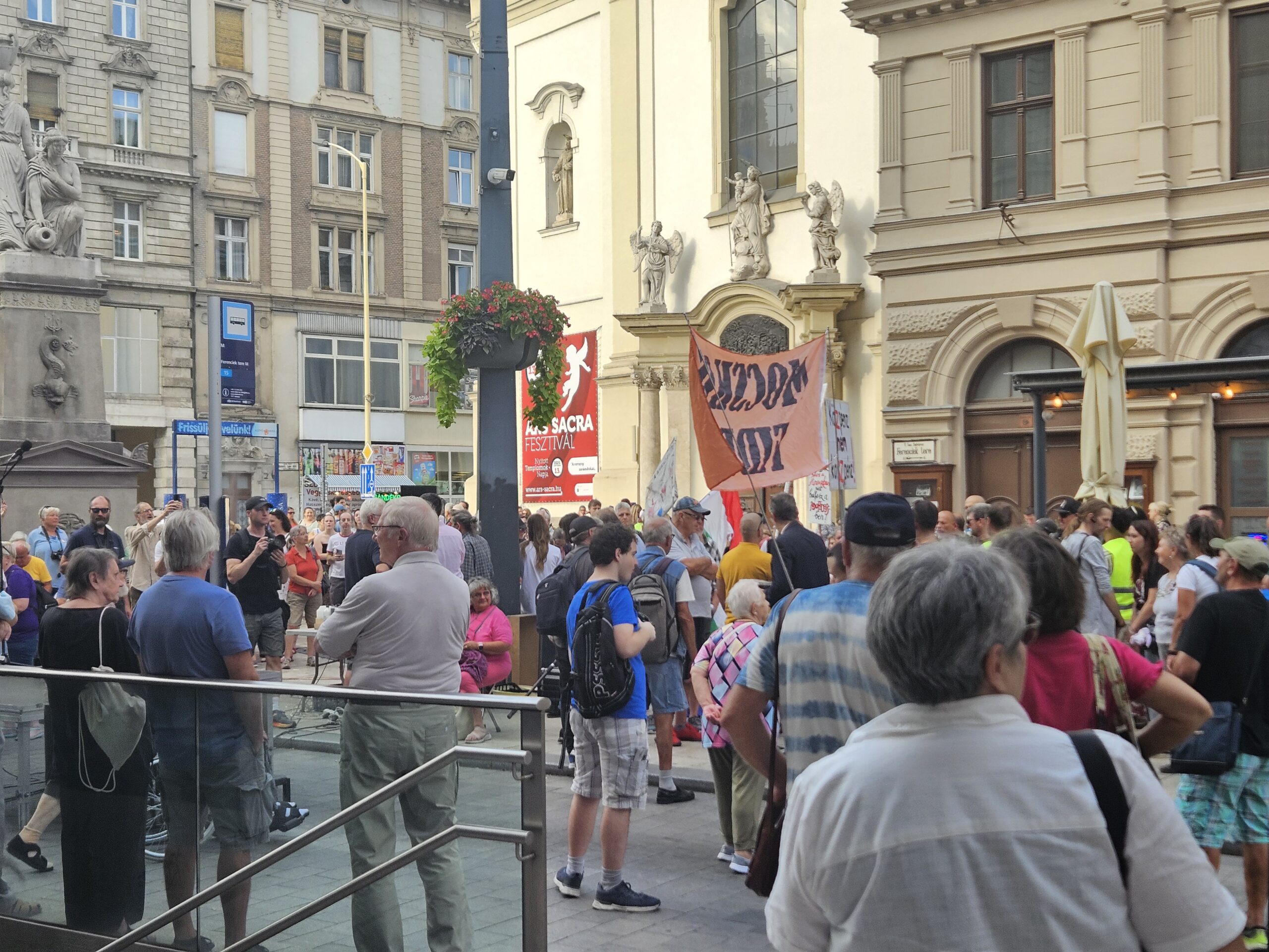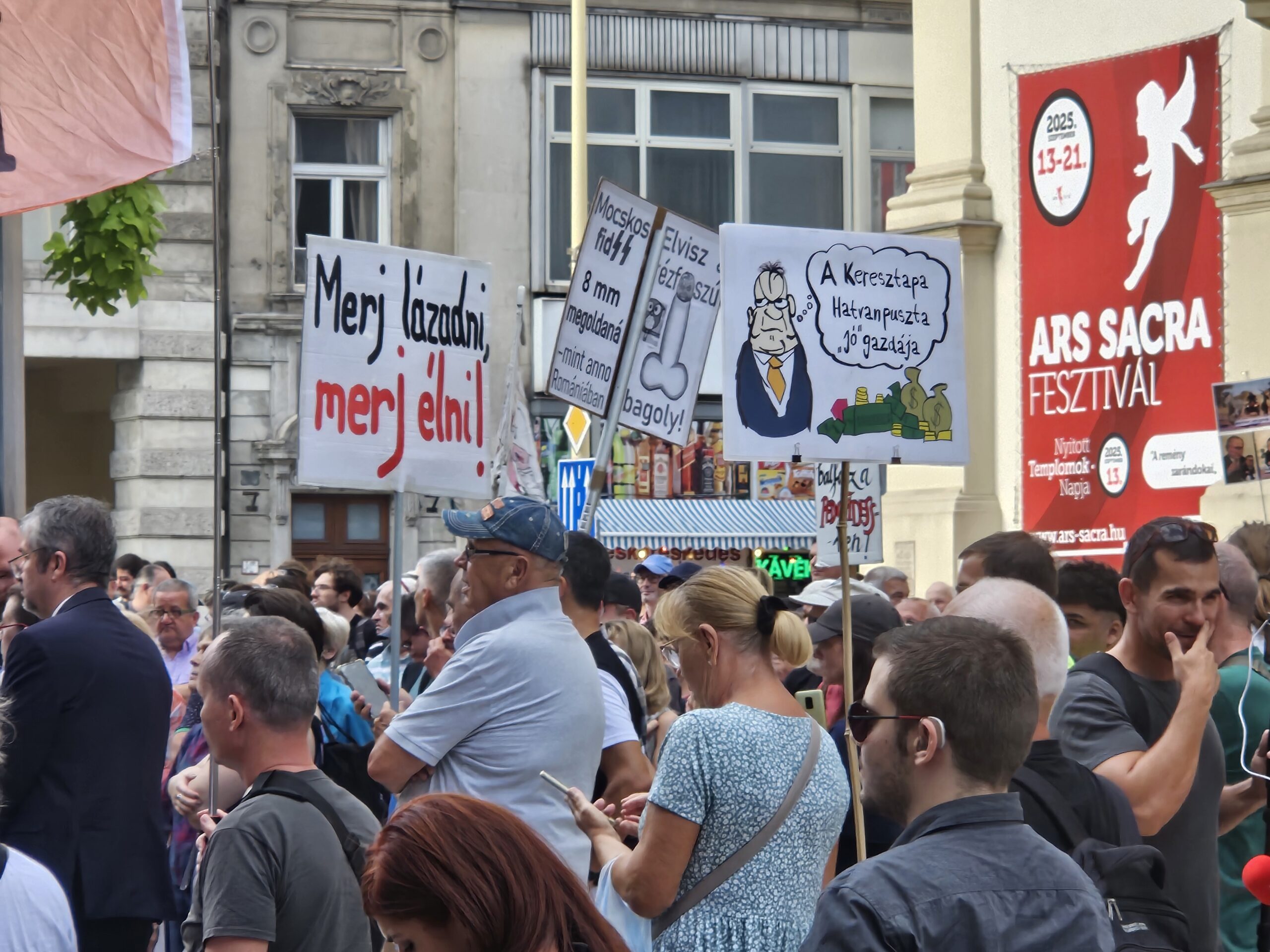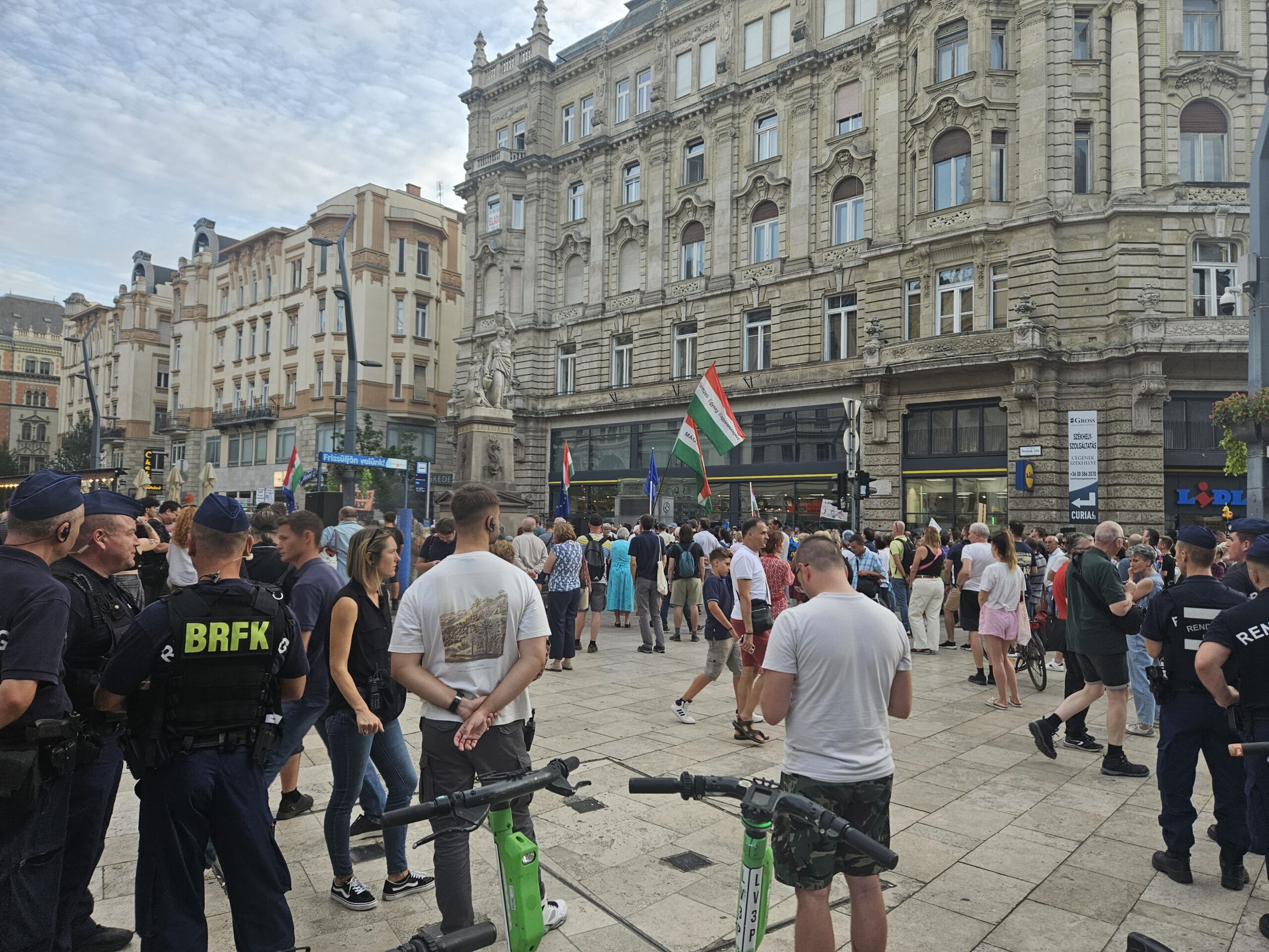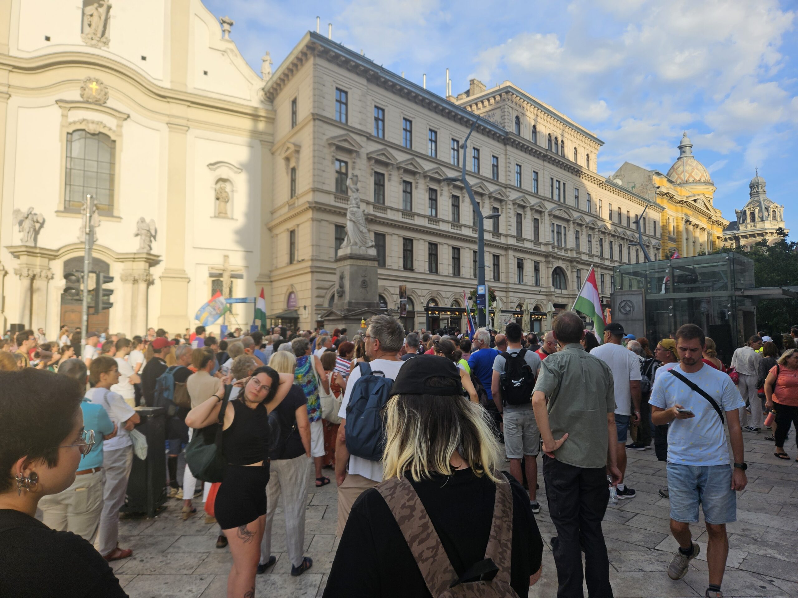 A szeptemberi újranyitó demonstráció kedden, kora este kezdődött a Ferenciek terén, ahol a kezdeti percekben még csak kisebb tömeg gyűlt össze. A színpad mellett zene szólt, a tér lassan telt meg, de a hangulat így is gyorsan tüzesedett: „Mocskos Fidesz!” – skandálták ritmusosan a résztvevők.