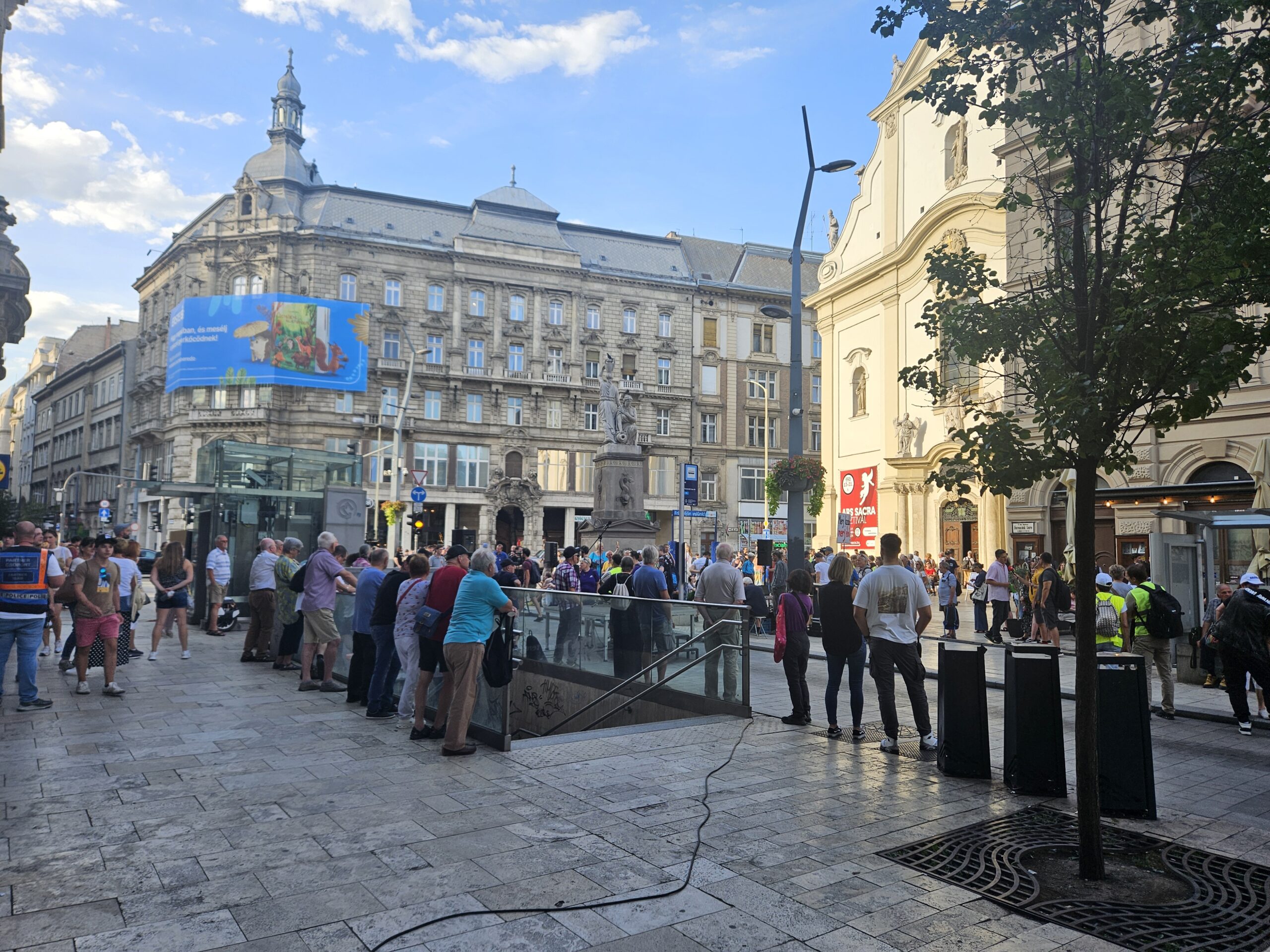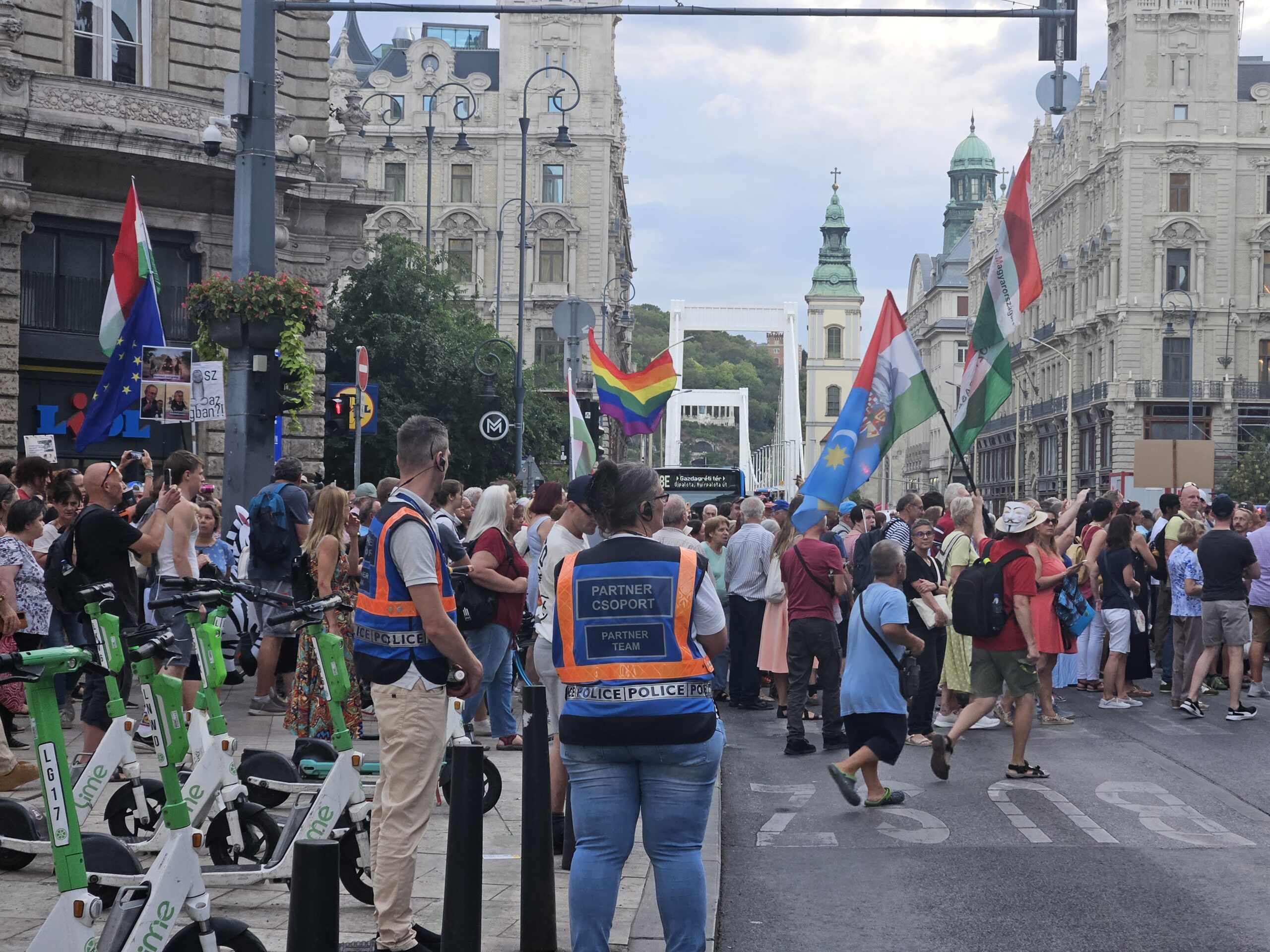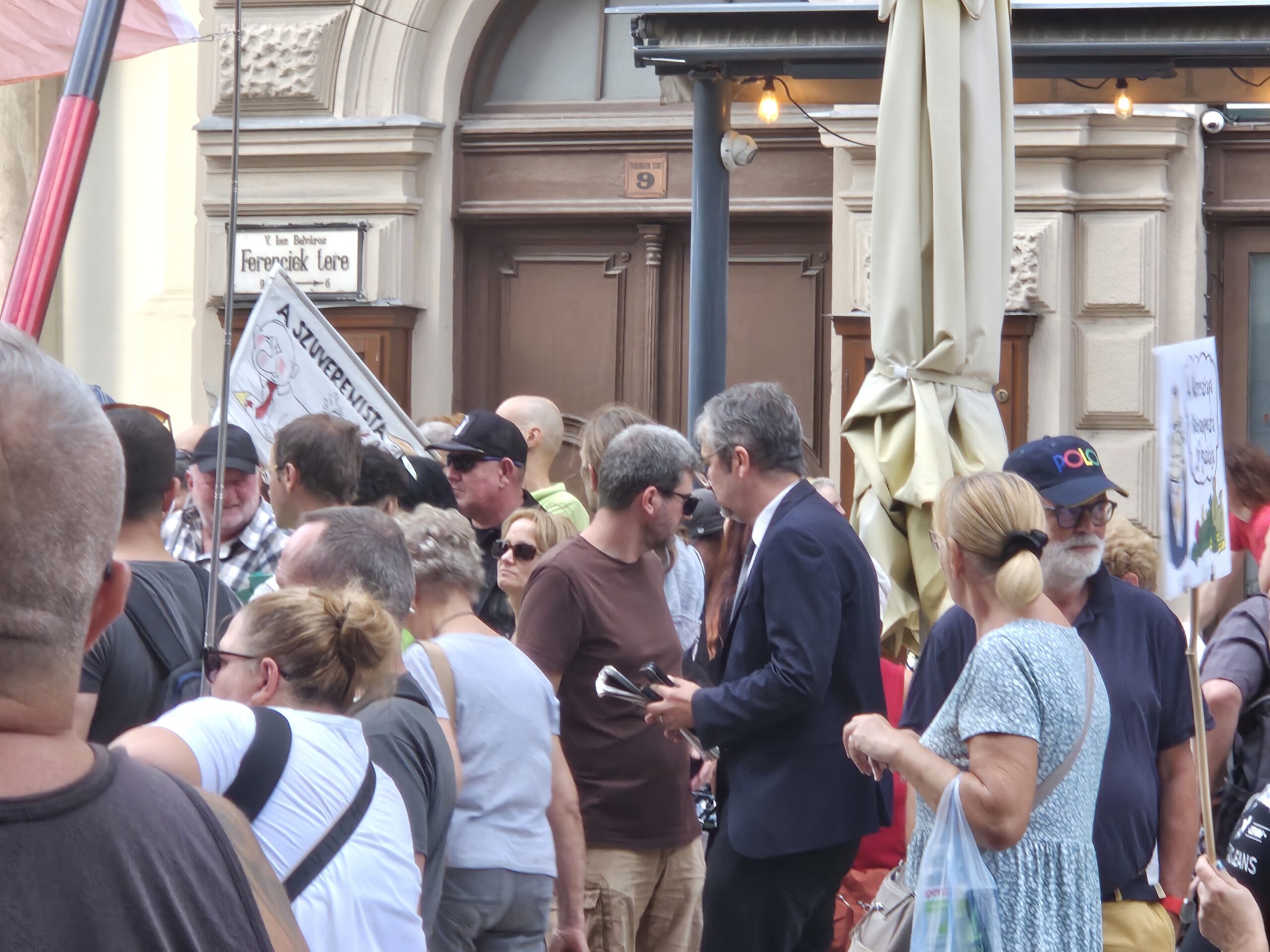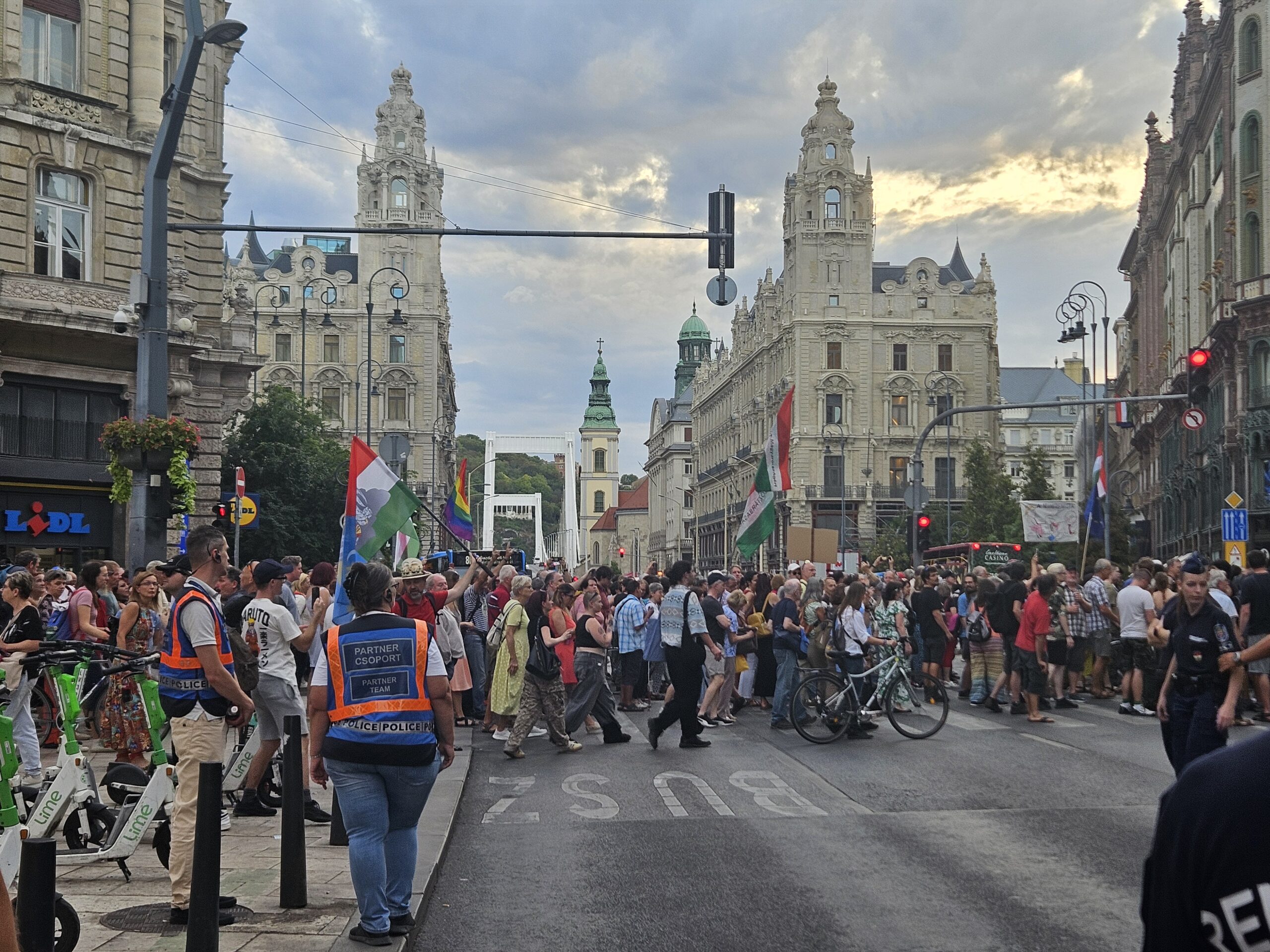A szeptemberi újranyitó demonstráció kedden, kora este kezdődött a Ferenciek terén, ahol a kezdeti percekben még csak kisebb tömeg gyűlt össze. A színpad mellett zene szólt, a tér lassan telt meg, de a hangulat így is gyorsan tüzesedett: „Mocskos Fidesz!” – skandálták ritmusosan a résztvevők.