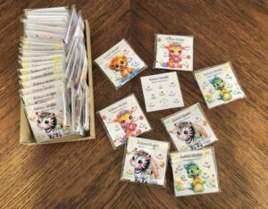 ⚠️A második képen a kis csomagok közelebbről láthatók – színes állatfigurák,jókívánságok szerepelnek rajtuk.