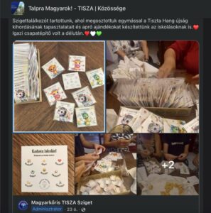 ⚠️A harmadik felvétel a legbeszédesebb: itt tisztán látszik, hogy a matricás kártyákon a Magyarkőris TISZA Sziget logója is szerepel, vagyis egyértelműen politikai szervezethez köthetők az ajándékok.
