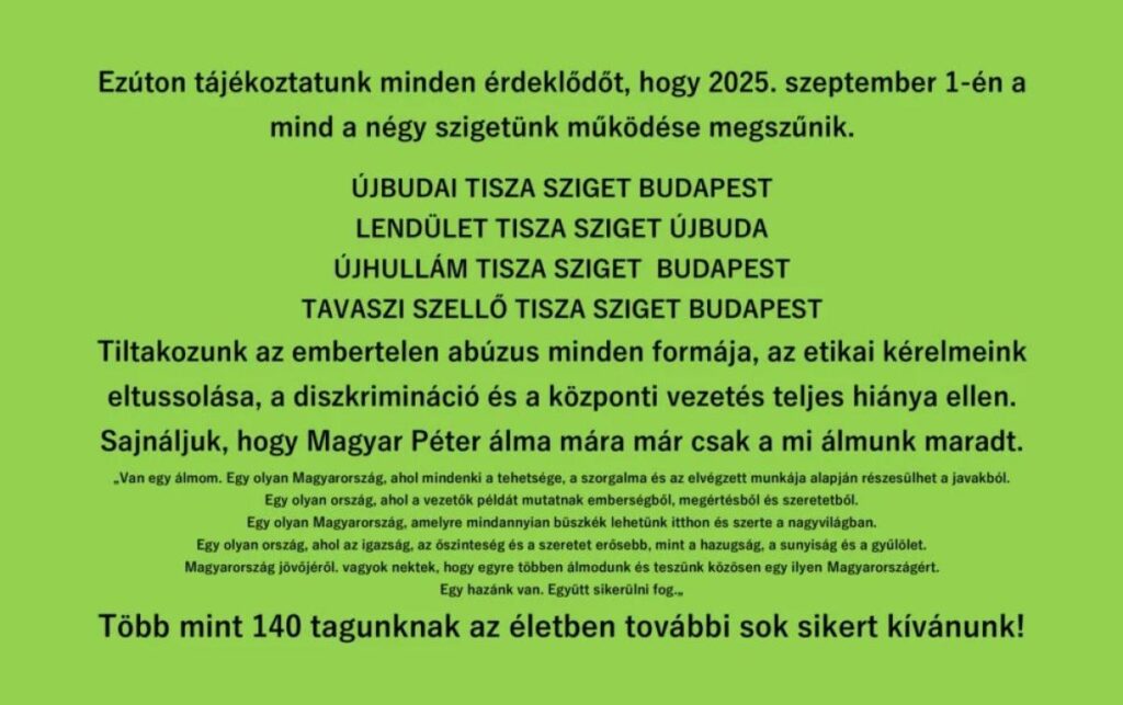 Szeptember 1-én megszűnt négy Tisza sziget. Mint honlapjukon írták (amíg még elérhető volt és le nem kapcsolták), megszüntetik a szigetek működését. Tiltakoznak az embertelen abúzus minden formája, az etikai kérelmeik eltussolása, a diszkrimináció és a központi vezetés teljes hiánya miatt.