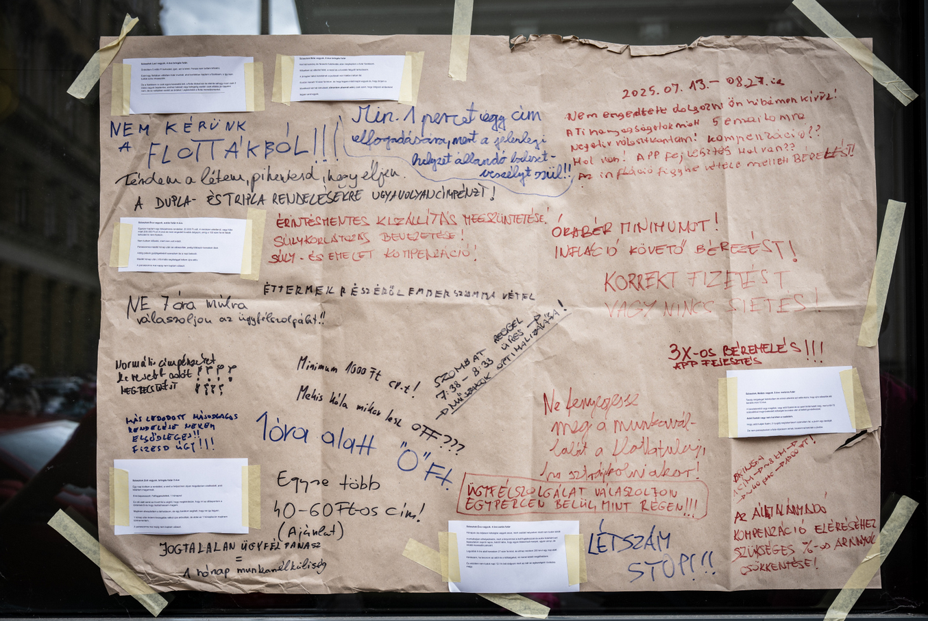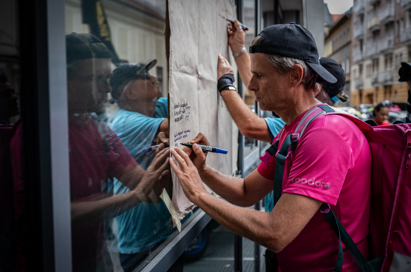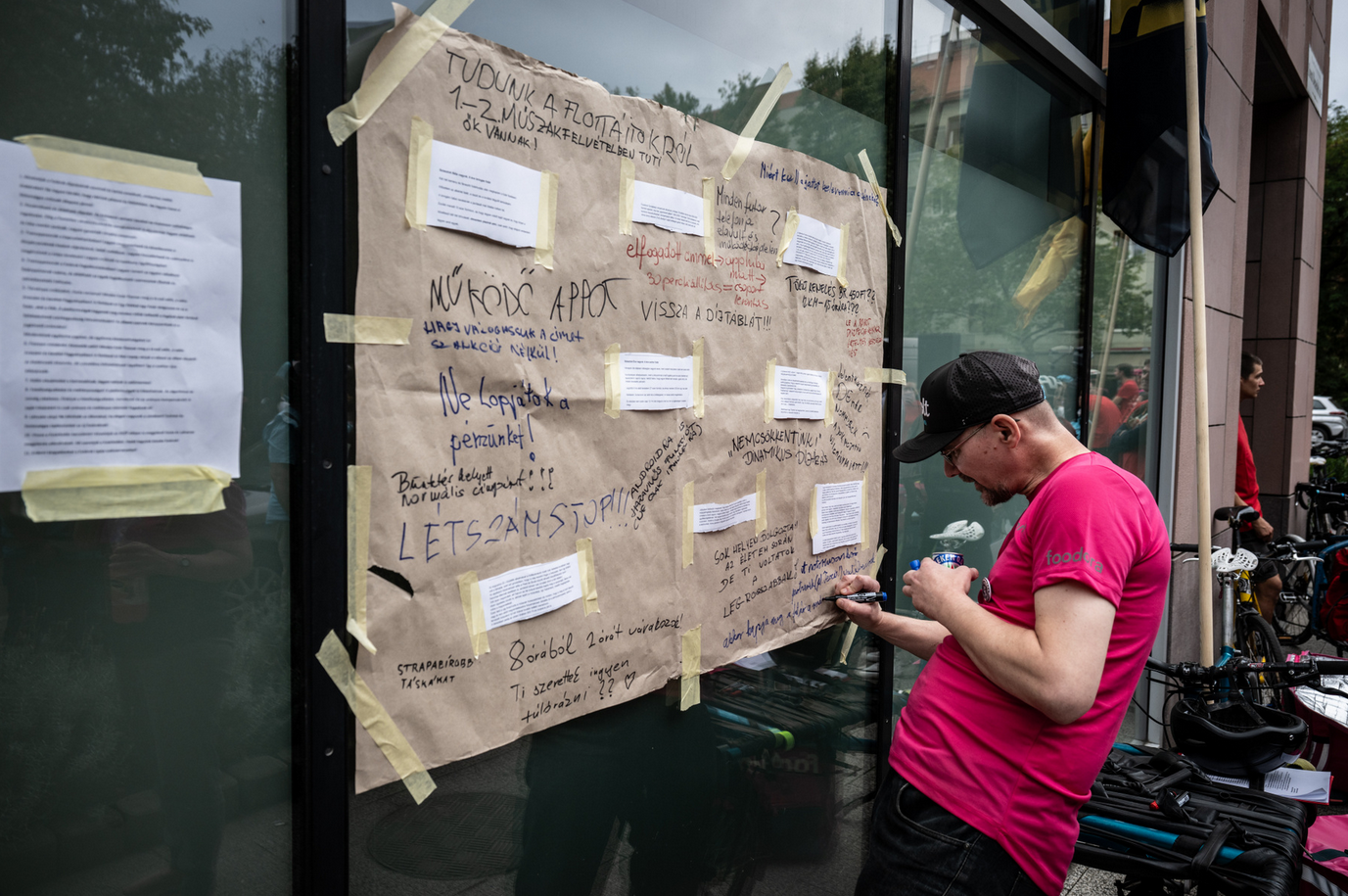 A békés hangulatú demonstráción a futárok mindkét épületnél a falra ragasztott papírra vetették panaszaikat, majd a követelések és rövid történetek felolvasása után továbbálltak. A tüntetésen megjelent néhány diák is, akik szolidaritásukról biztosították a futárokat. A Futárok Ligája követeléseivel kapcsolatban megkerestük a Woltot és a Foodorát, amint megérkeznek a válaszaik, közöljük azokat.