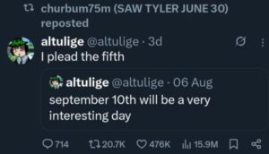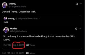 Ezt a fiókot az utóbbi időben elkezdte több más felhasználó követni. Ilyen a @TallyHallAlbum névre hallgató közösségi profil is, amely szeptember 3-án – azaz egy héttel a merénylet előtt – az alábbi posztot tette ki az X-re: