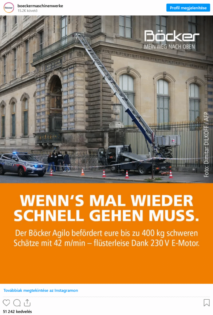 A Böcker nevű német vállalat igyekszik a legtöbbet kihozni abból, hogy az általuk gyártott kosaras emelőt használta az a csapat, amikor a múlt héten felbecsülhetetlen értékű ékszereket loptak el a Louvre-ból.