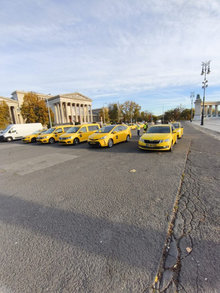 Közben a Városháza előtt is zajlott a demonstráció: reggel kilenc órára mintegy negyven taxi sorakozott fel, jóval kevesebb, mint a szeptemberi tiltakozás idején. A Fővárosi Taxi Egyesület (FŐTE) szervezésében tartott akció hivatalos engedéllyel zajlott, és egész napra, egészen este hatig tervezték.