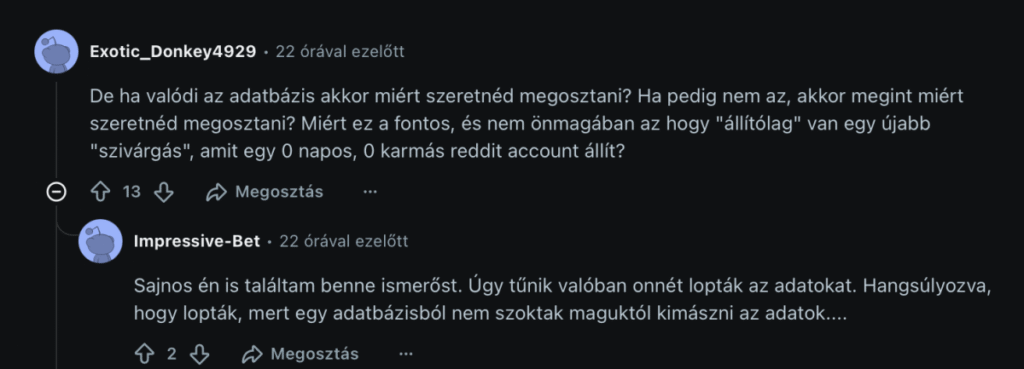 Néhány órával később a Redditen is felbukkant egy hasonló bejegyzés, a r/programmingHungary aloldalon. A posztot onnan is törölték a moderátorok, de a hozzászólások között több felhasználó arról számolt be, hogy a listában valódi neveket, címeket, telefonszámokat és GPS-adatokat talált – köztük a sajátjukat is.