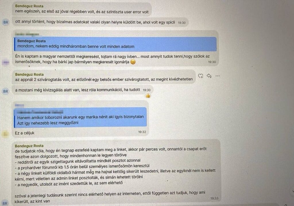 De térjünk vissza a zárt tiszás Signal-csoporthoz, Rosta Bendegúz ugyanis vasárnap arról is részletesen beszélt, hogyan próbálták a párt informatikusai eltüntetni az adatszivárgás nyomait. Elmondása szerint a Redditről egy Tisza-sziget-tag távolíttatta el azonnal – mind a két – bejegyzést, a Prohardver fórumáról pedig ő maga egy személyes ismerősén keresztül, hozzávetőleg másfél órán belül. (Hozzátesszük: ez sem bizonyult elég gyorsnak, a Magyar Nemzet munkatársa ugyanis olvasta a posztot, annak legfontosabb megállapításai pedig szerepelnek is az adatszivárgásról beszámoló cikkünkben.) Rosta közölte a csoporttagokkal azt is, hogy a négy külföldi oldalról is eltávolíttatták a kiszivárgott adatbázist. Ugyanakkor utalt rá, hogy ami egyszer kikerült, az kint van, vagyis a lista máshonnan is elérhető lehet, akármikor.
