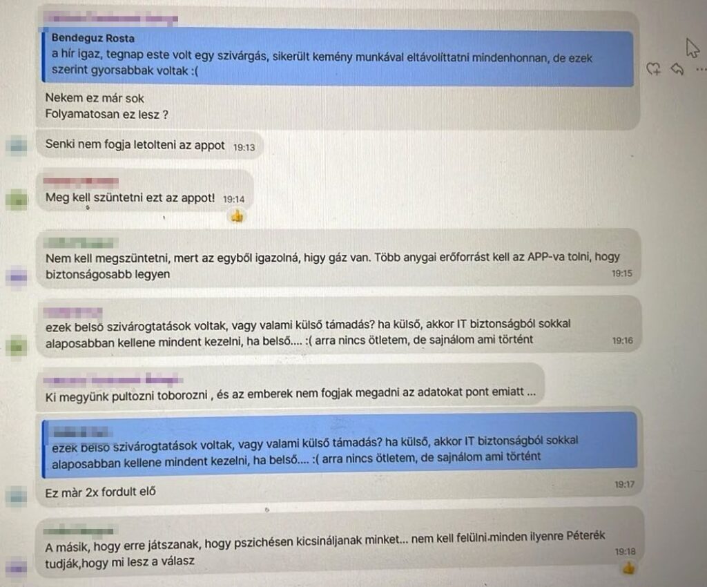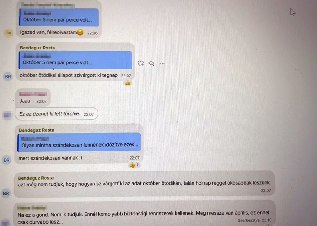 Az általunk megismert beszélgetésben van egy másik igen érdekes mozzanat is. Az egyik tiszás csoporttag ugyanis arra hívta fel a többiek figyelmét, vigyázni kell, ki ne derüljön, hogy valójában október 5-én szivárogtak ki a személyes adatok az alkalmazásból, mert akkor a Nemzeti Adatvédelmi és Információszabadság Hatóság (NAIH) megbüntetheti a pártot, amiért nem jelentették időben az incidenst. De legalább ennyire kellemetlen lenne Magyar Péter számára az is, ha kiderülne, hogy egy hónapon keresztül nem vették észre, mekkora szivárgás történt az applikációjukból. Ez utóbbi lehetőség azért is lenne rendkívül kínos, mert a Tisza Párt elnöke az elmúlt napokban arról beszélt a sajtóban, hogy informatikusaik heroikus küzdelmet folytatva verik vissza hónapok óta az orosz hekkerek támadásait. Ehhez képest rendkívül dilettánsnak tűnnének a Tisza szakemberei, ha kiderülne: közel egy hónapig nem érzékelték, hogy kikerültek a felhasználók személyes adatai.