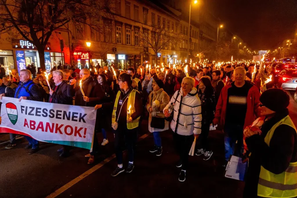feliratú molinó mögött vonulva nagyon látványos fáklyás menettel a Jókai utca, Podmaniczky utca, Bajcsy-Zsilinszky út, Bank utca útvonalon érkeztek a Szabadság térre, a Magyar Nemzeti Bank (MNB) és a Bank Center közti területre, ahol Z. Kárpát Dániel azt mondta,