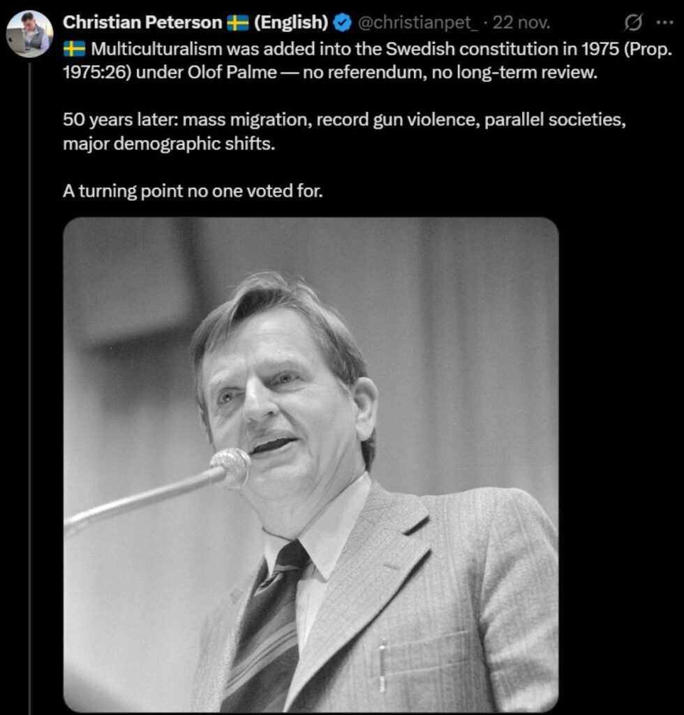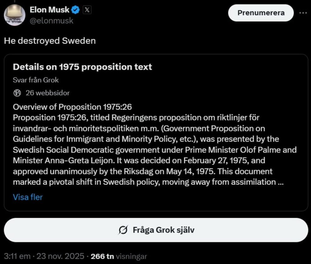 Amikor Christian Peterson, az X szabadúszó újságírója írt a korábbi szociáldemokrata miniszterelnökről, Olof Palme-ról és annak 1975-ös, pártbeli kollégájával, Anna-Greta Leijonnal közösen megfogalmazott javaslatáról, amelynek célja Svédország multikulturálisvá tétele volt, Musk azzal válaszolt, hogy