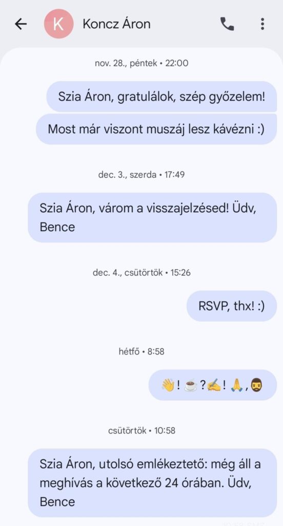 Meghívtalak kávézni. Az elmúlt két hétben 6 sms-t küldtem neked (arra a számra, amiről korábban már válaszoltál nekem).